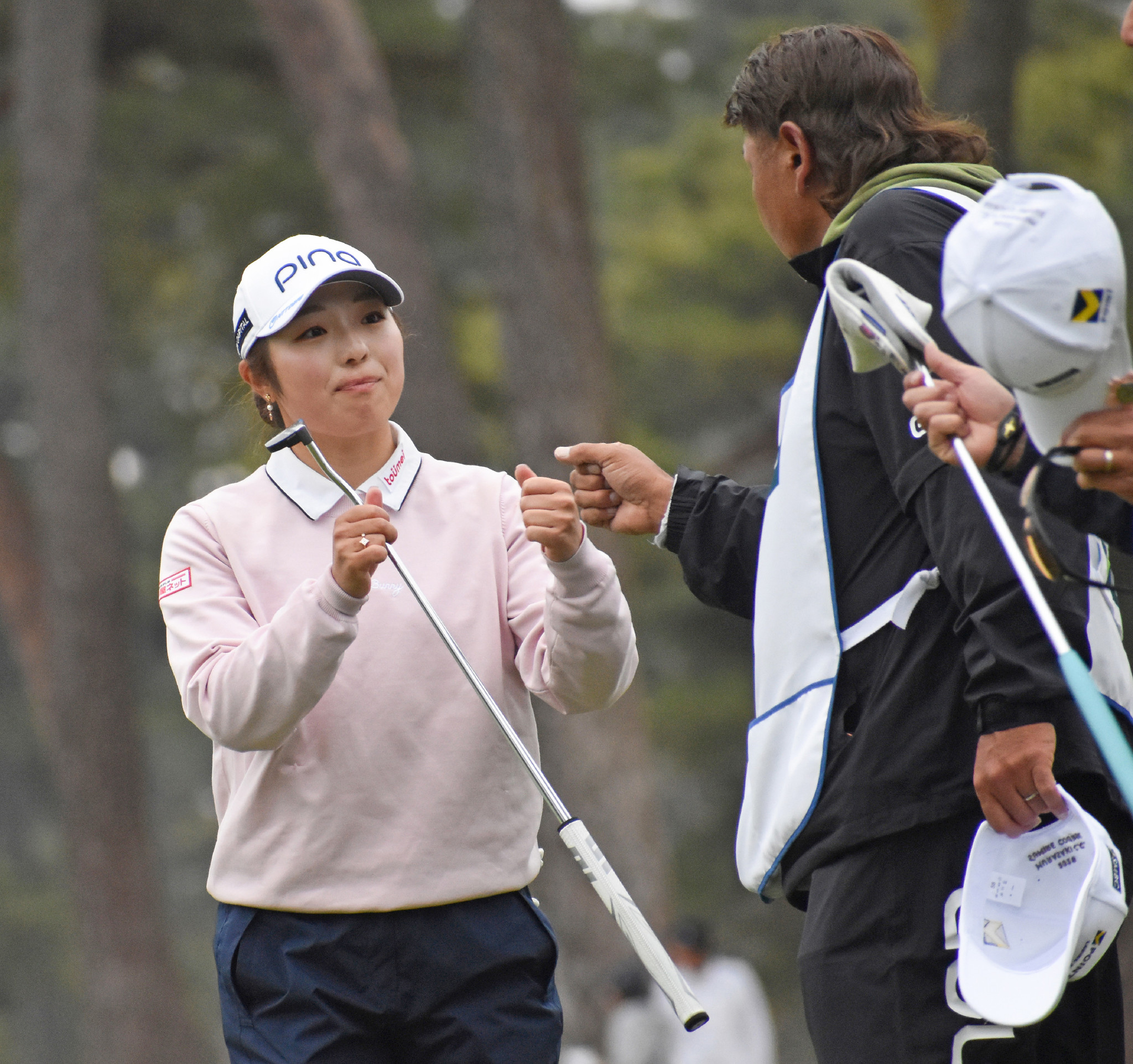 Vポイント女子ゴルフ。首位に1打差の2位で初日を終えた佐久間朱莉(左)=20日、千葉・紫CCすみれ