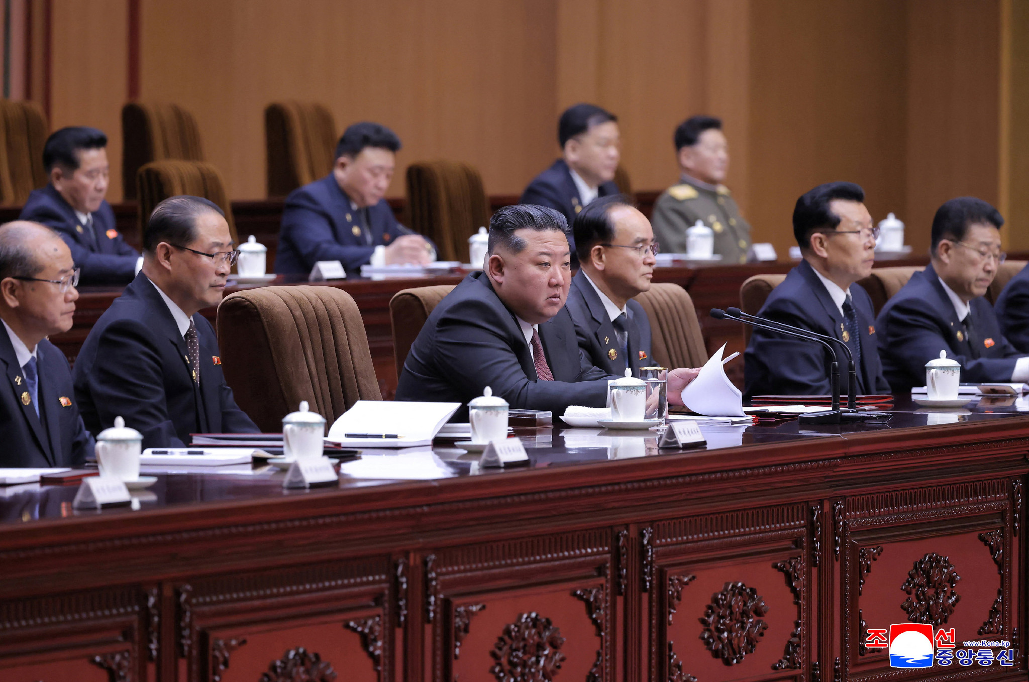 北朝鮮の第15期最高人民会議が22日、平壌で開幕し、国家最高指導機関トップで国家元首に当たる国務委員長に金正恩朝鮮労働党総書記(前列左から3人目)を再任することを満場一致で決定した=朝鮮中央通信配信【ロイター時事】