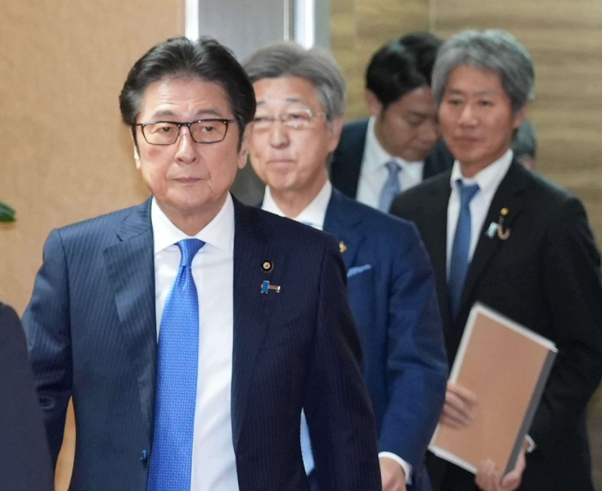 自民党本部に入った参院幹部の(手前から)松山政司氏、石井準一氏、磯崎仁彦氏=23日午前、東京・永田町