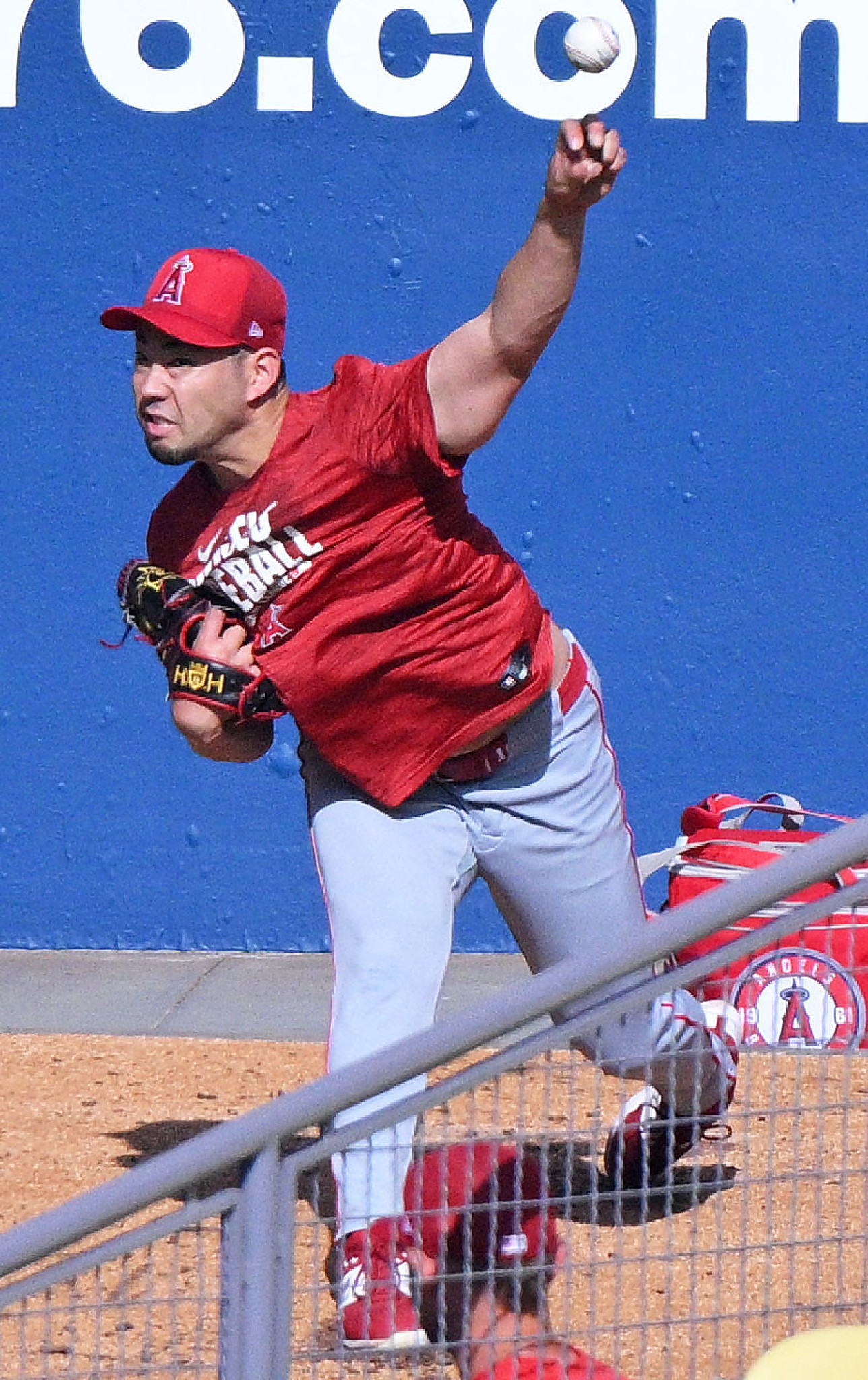 エンゼルスのスズキ監督は23日、菊池雄星投手が開幕2戦目となる27日(日本時間28日)のアストロズ戦に先発すると明らかにした。写真はブルペンで投球練習する菊池=23日、ロサンゼルス