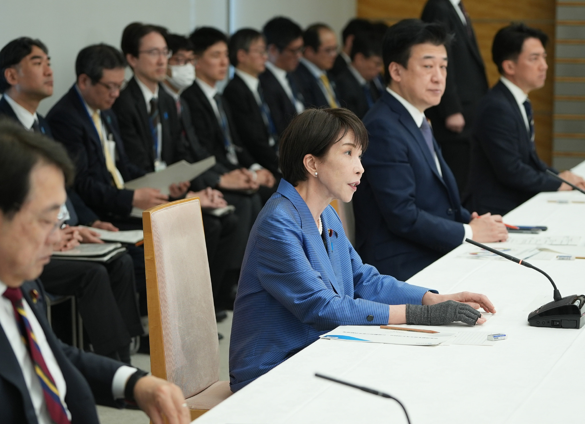 中東情勢に関する関係閣僚会議で発言する高市早苗首相(中央)=24日午前、首相官邸