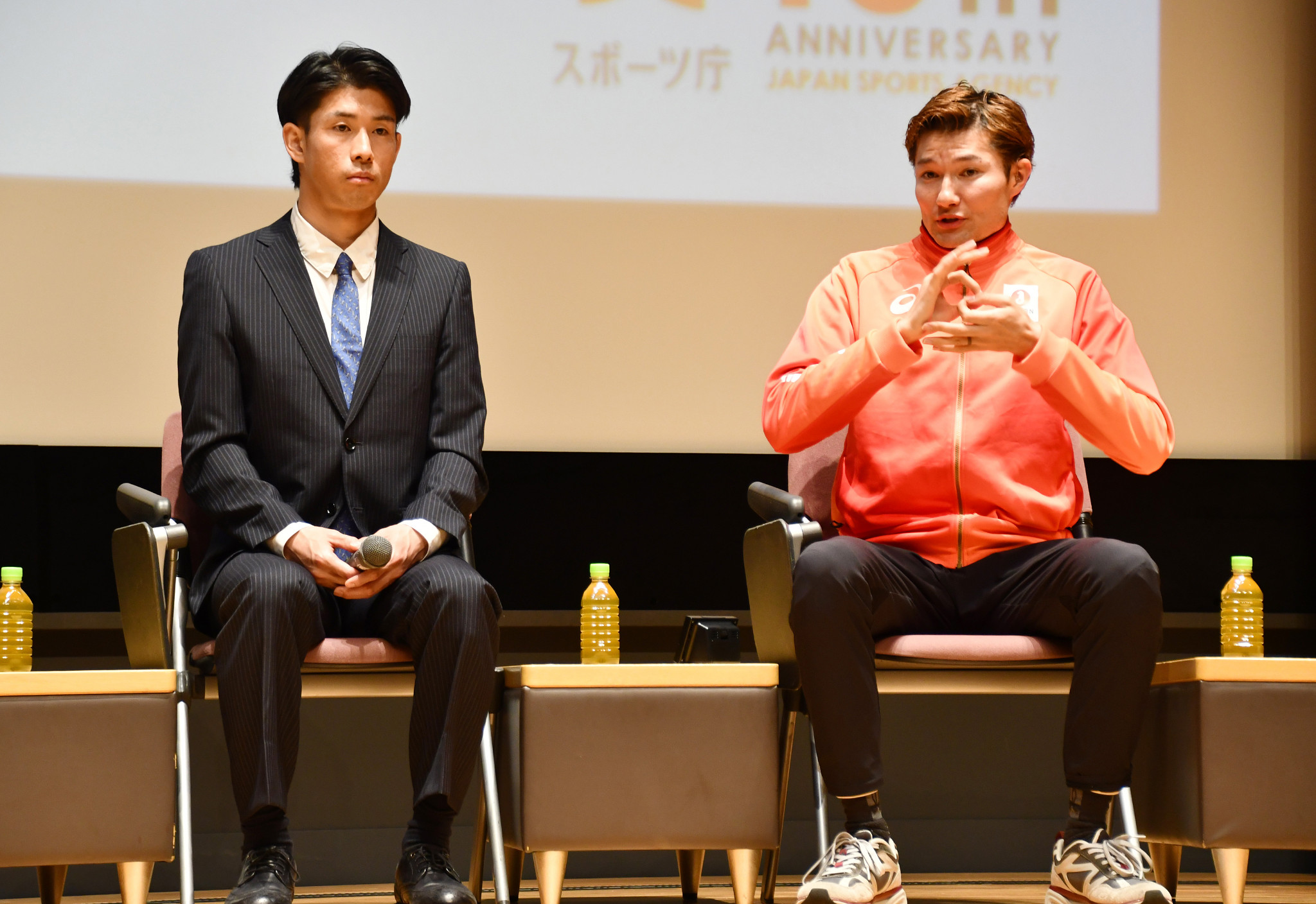 スポーツ庁の創設10周年を記念したイベントのトークショーに登場したデフ陸上の山田真樹(右)とスキーモーグルの堀島行真=25日、東京都千代田区