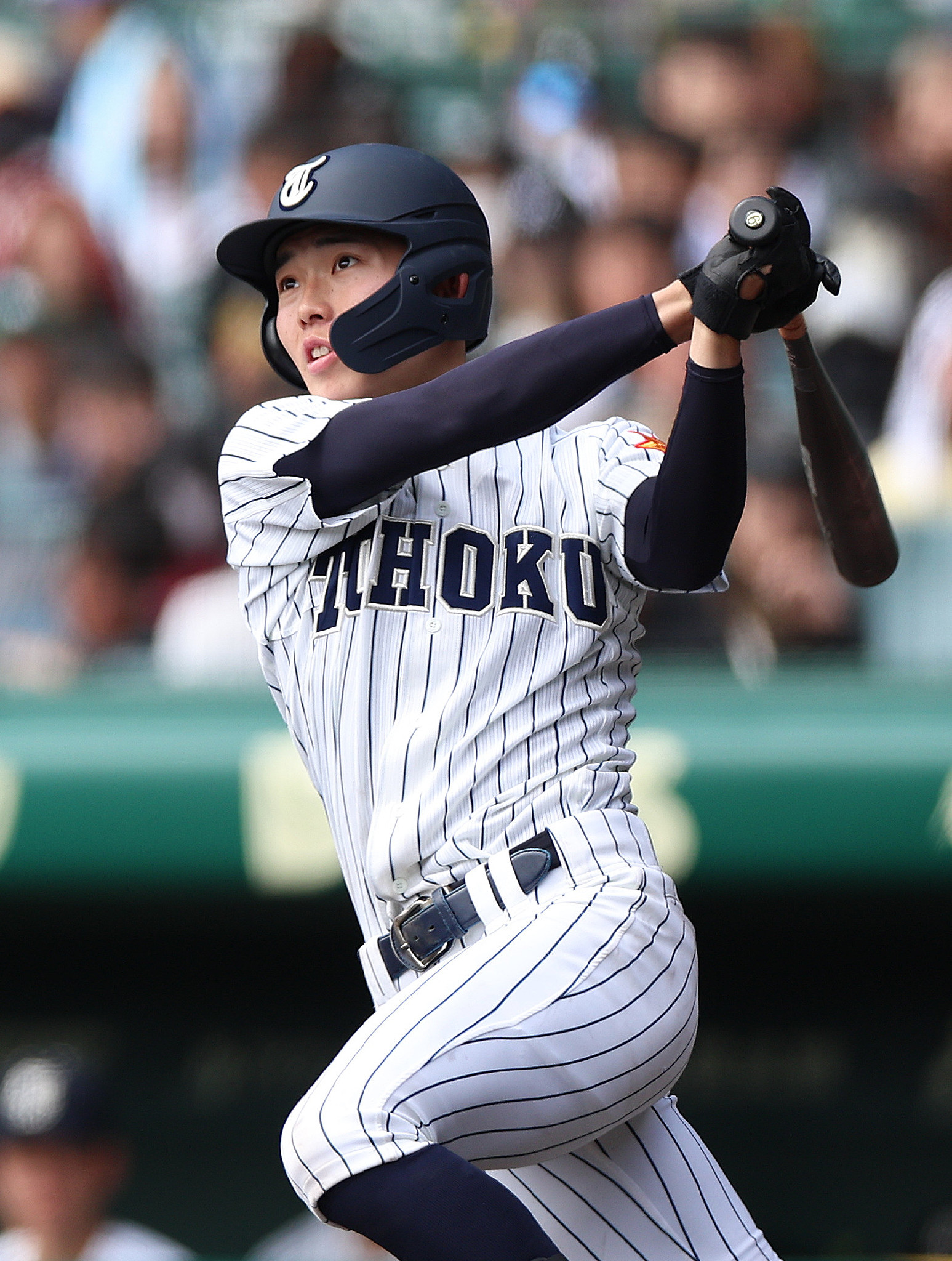 東北―英明。8回裏東北1死、松本がソロ本塁打を放つ=26日、甲子園