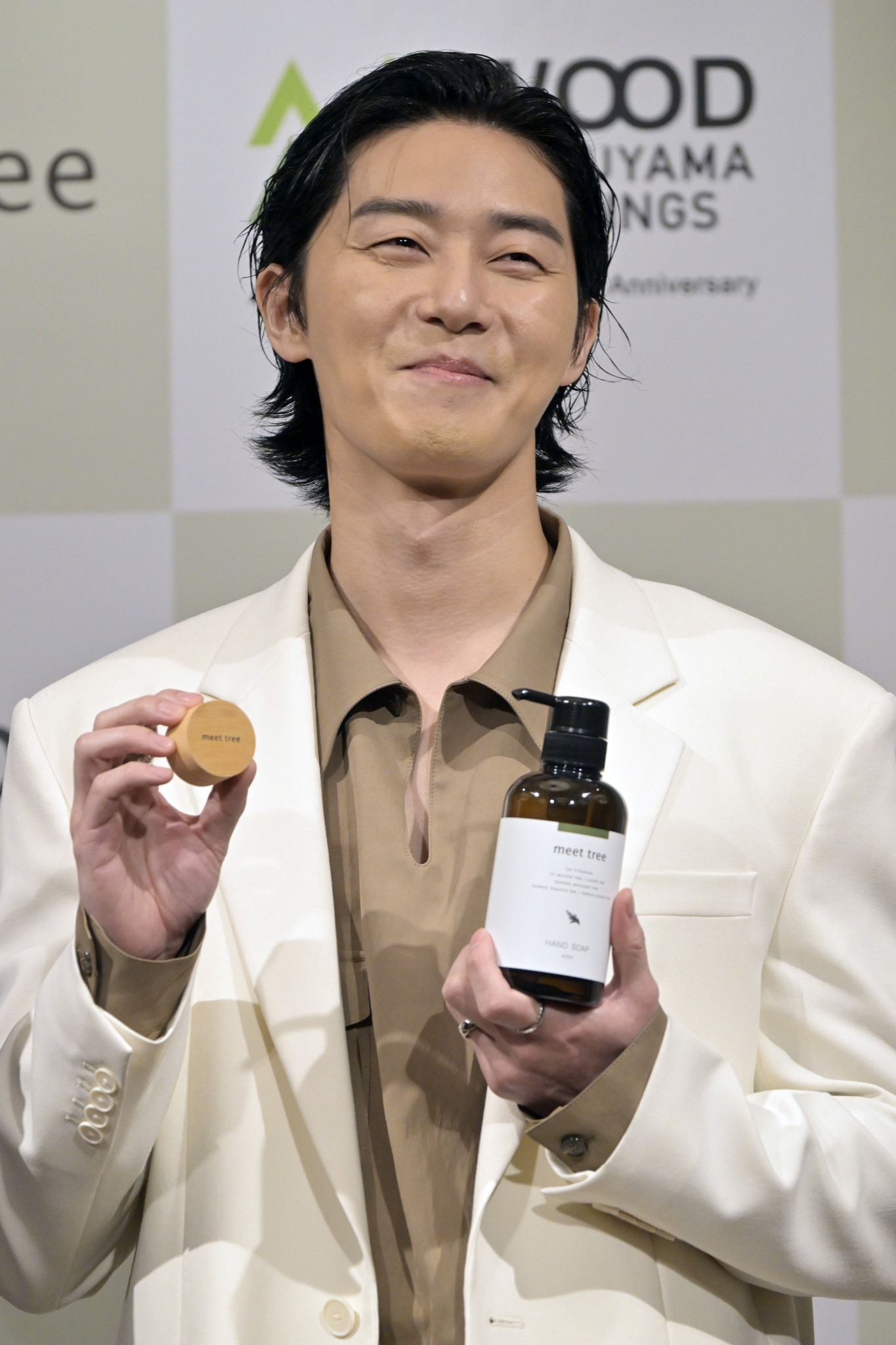 ヒノキなどの木材を配合した丸山木材ホールディングスのライフスタイルブランド「meettree」のアンバサダーに韓国の俳優パク・ソジュンさんが就任。スキンケアはクレンジングが大事と話した=26日、都内【時事通信フォト】