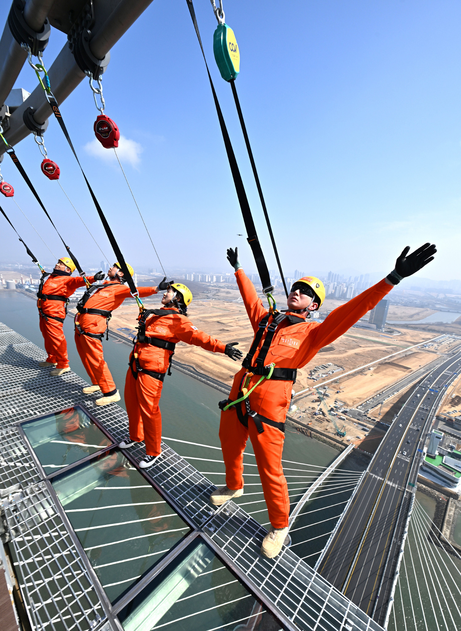 25日、韓国の仁川市に架かる橋の展望台で、命綱を装着して歩く「エッジウォーク」に参加する人たち。ギネス世界記録にも認定された「世界一高い海上橋の展望台」では、来月からこのような空中散歩が楽しめるという【EPA時事】