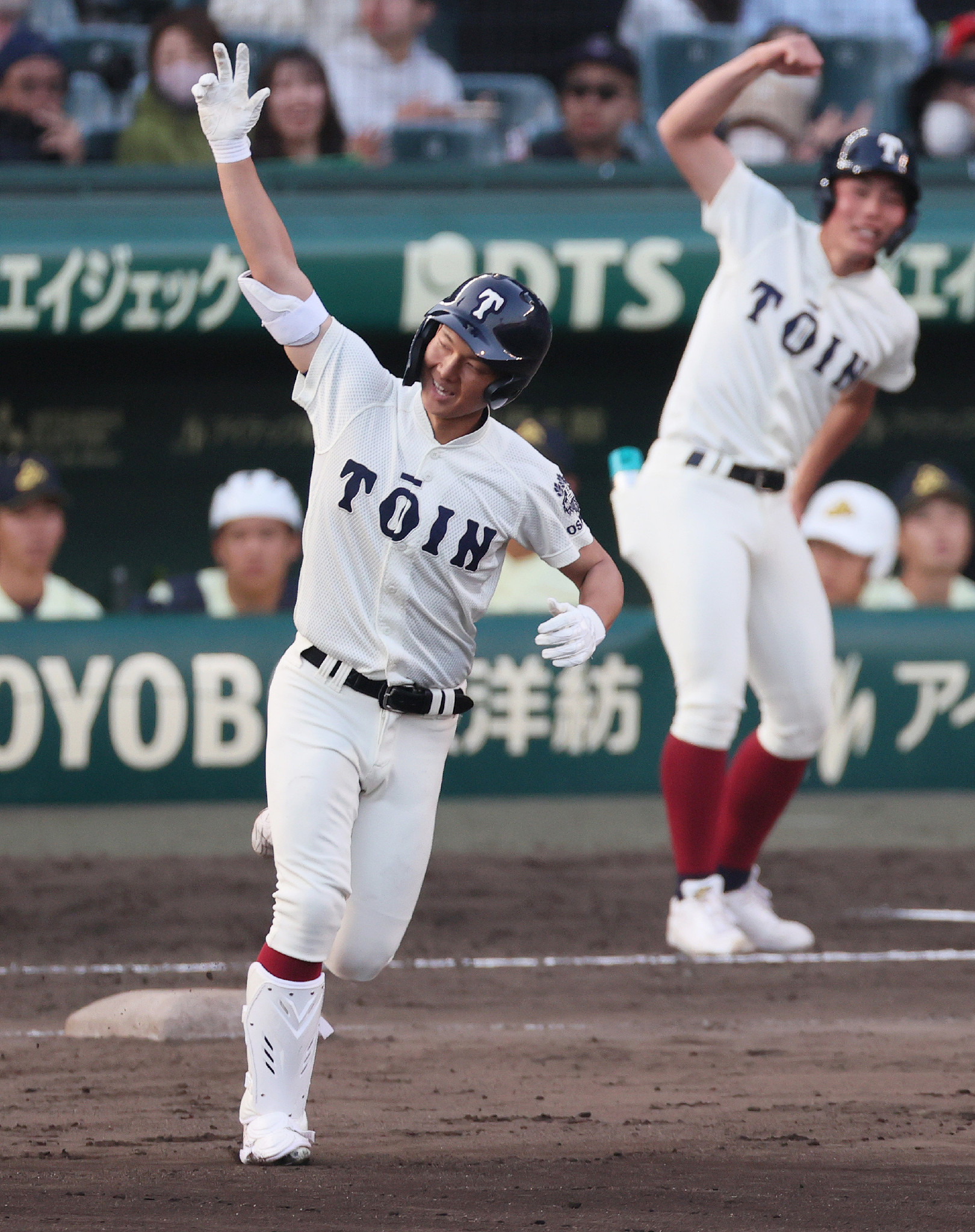 英明―大阪桐蔭。6回裏大阪桐蔭無死、勝ち越しのソロ本塁打を放ち、喜ぶ谷渕(左)=27日、甲子園