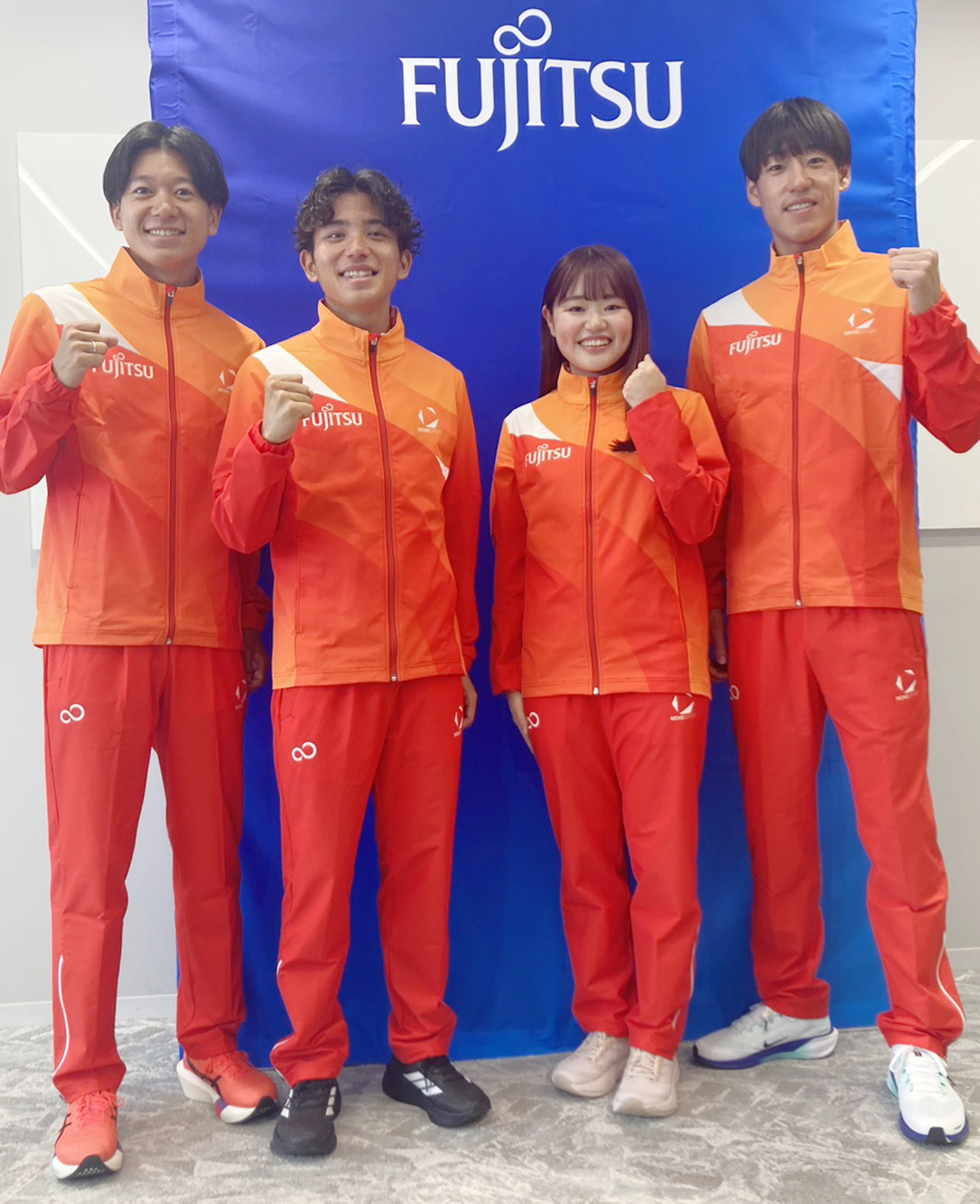 4月に富士通陸上部に加入する(右から)小川大輝、柳井綾音、上原琉翔、伊藤蒼唯=27日、川崎市