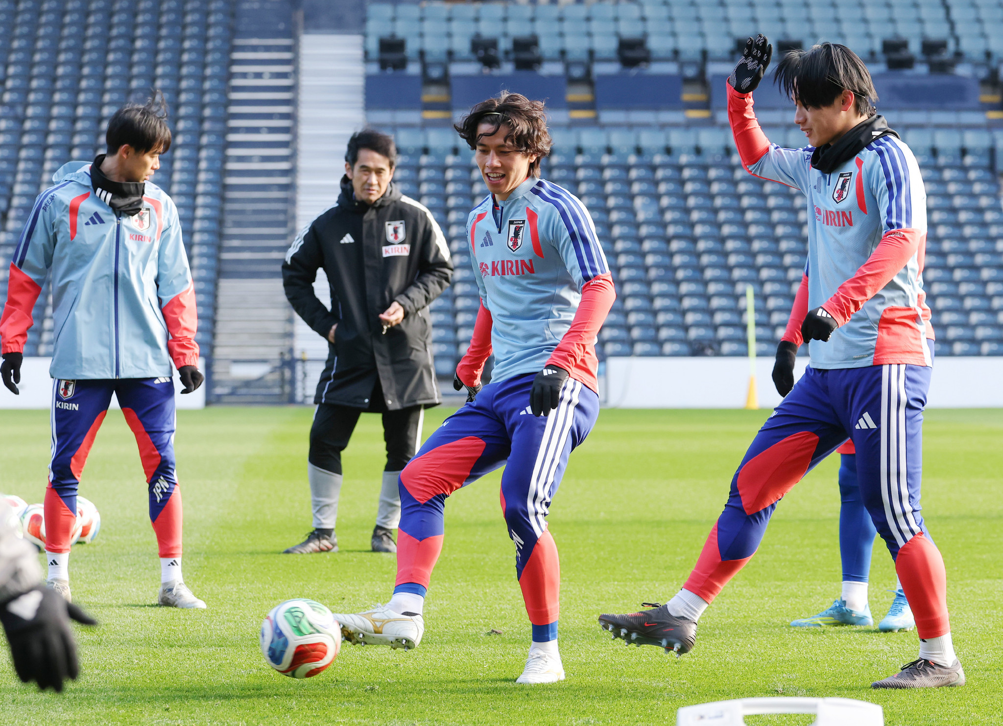 スコットランド戦を翌日に控え、練習する田中(右から2人目)ら=27日、英グラスゴー