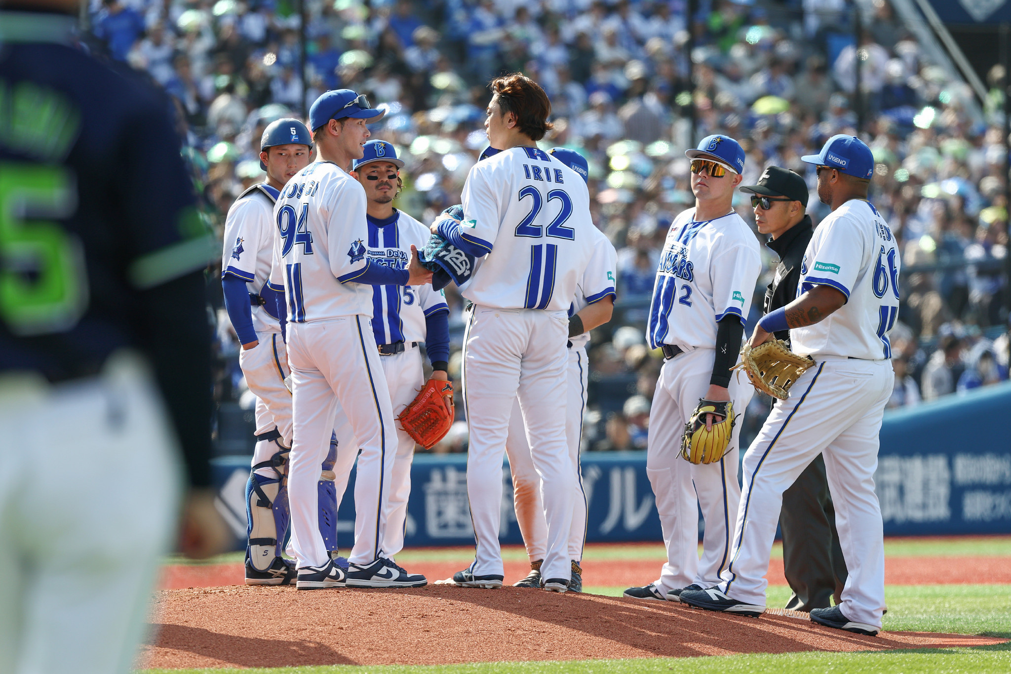 DeNA―ヤクルト。3回、ヤクルトに勝ち越しを許し、マウンドに集まる先発の入江(中央)らDeNAナイン=28日、横浜