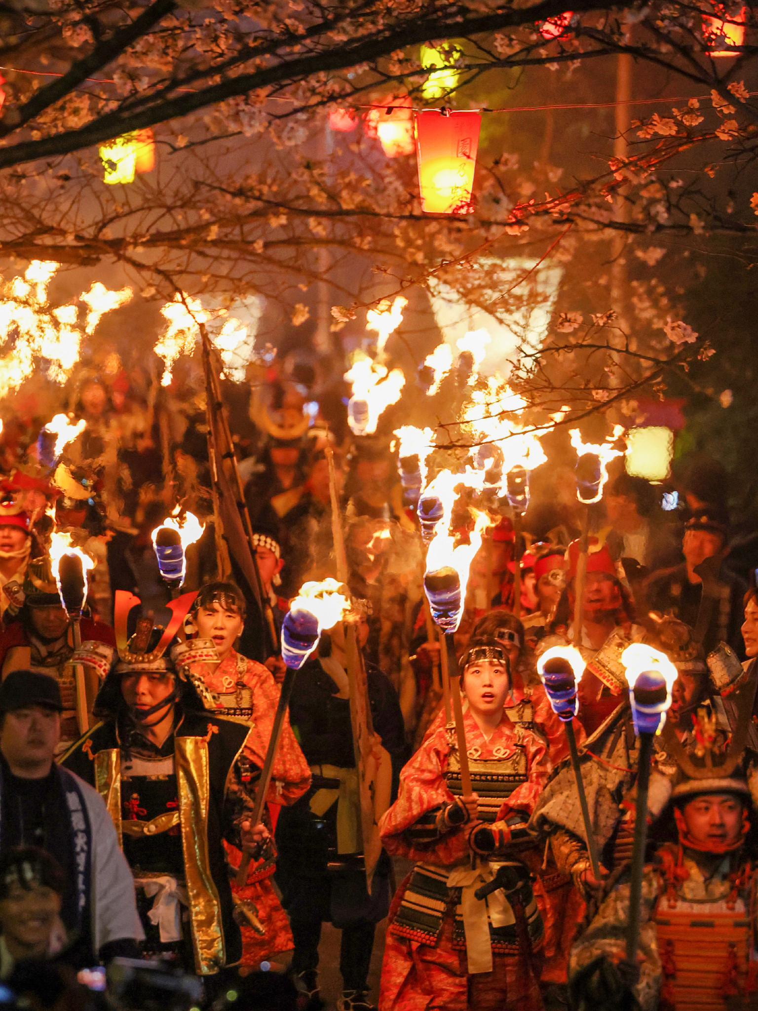 長崎県雲仙市千々石町で28日、武士に扮(ふん)した総勢150人がたいまつを持って桜並木の下を練り歩く「観櫻火宴(かんおうかえん)」が行われた。地元の有志が橘公園周辺の夜桜を広報するため始めた火祭り。
