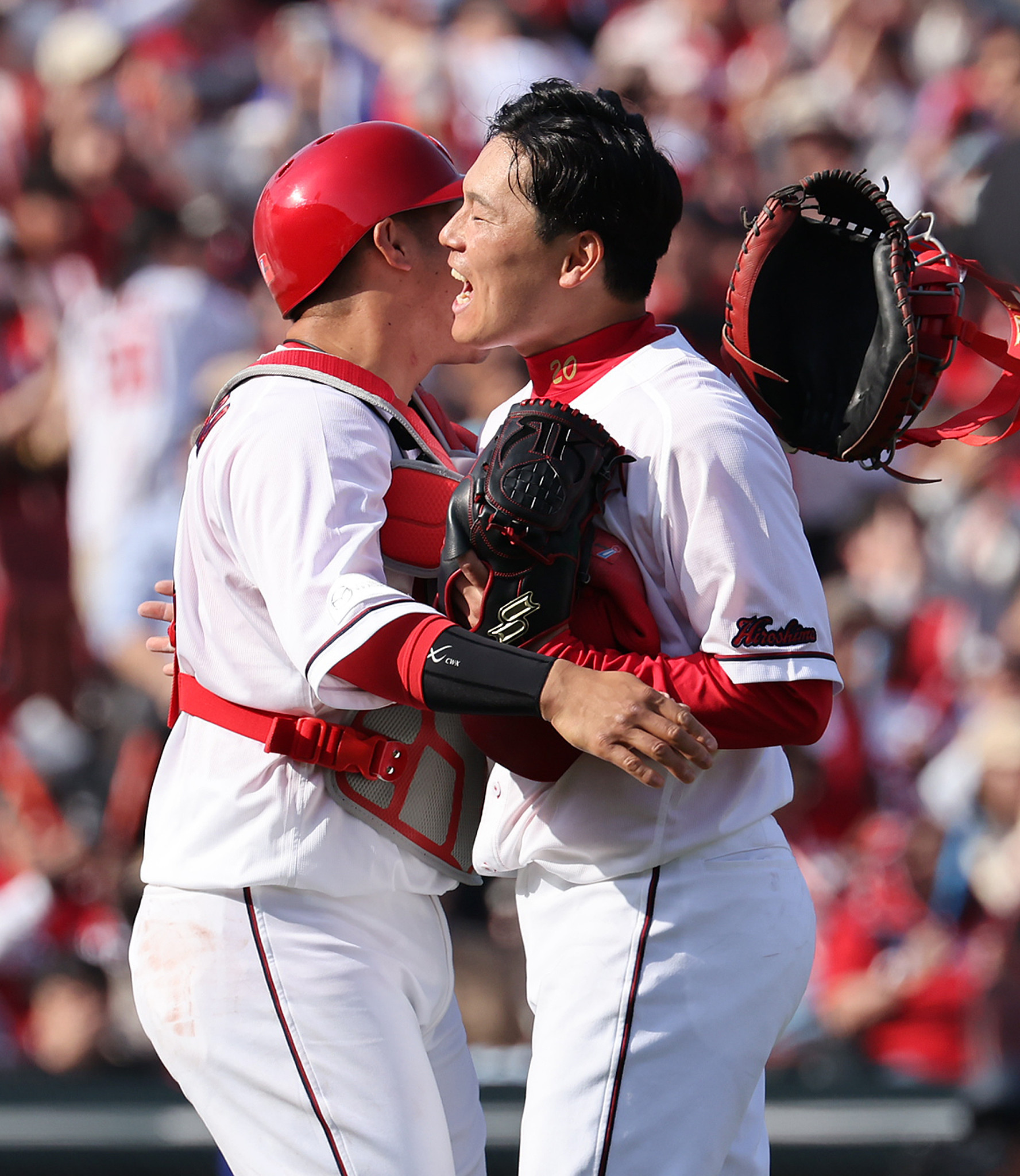 広島―中日。完封勝利し、喜ぶ広島の栗林(右)=29日、マツダスタジアム