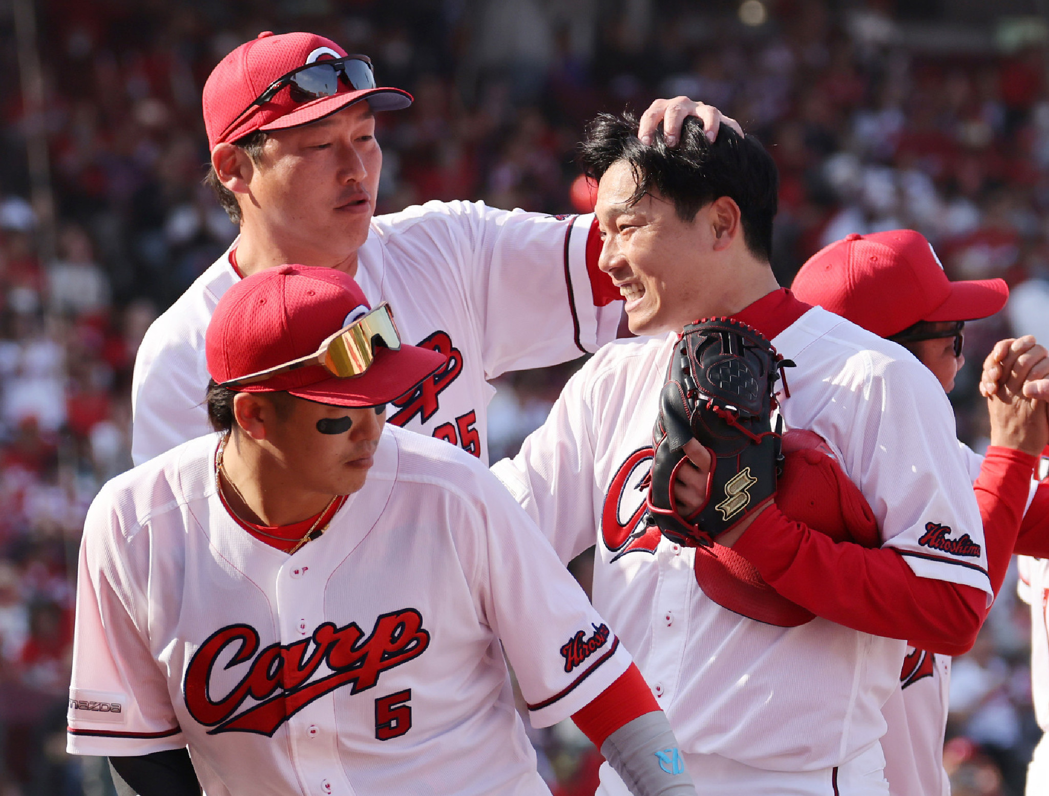 広島―中日。新井監督(左奥)に祝福される完封勝利した広島の栗林(右)=29日、マツダスタジアム