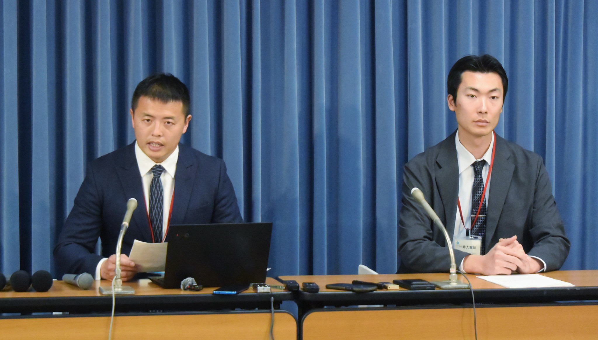 記者会見するボブスレー男子元日本代表の村上健二さん(左)と金子慶輝さん=30日、文科省