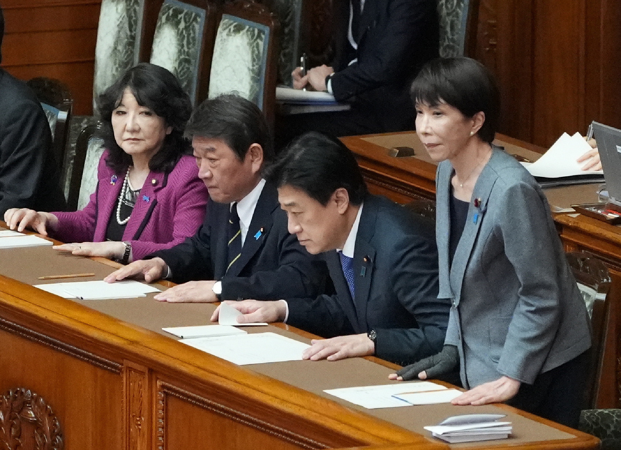 参院本会議で暫定予算が可決、成立し、一礼する高市早苗首相(右端)=30日午後、国会内