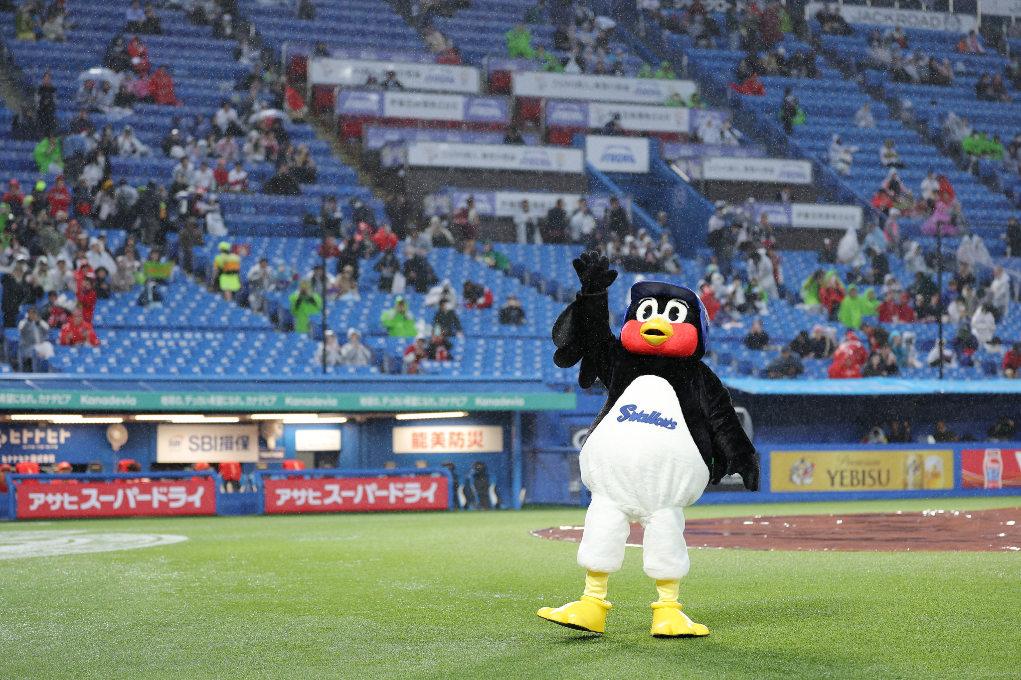 ヤクルト―広島。本拠地開幕戦で復活し、来場者に手を振るヤクルトの球団マスコット「つば九郎」=31日、神宮
