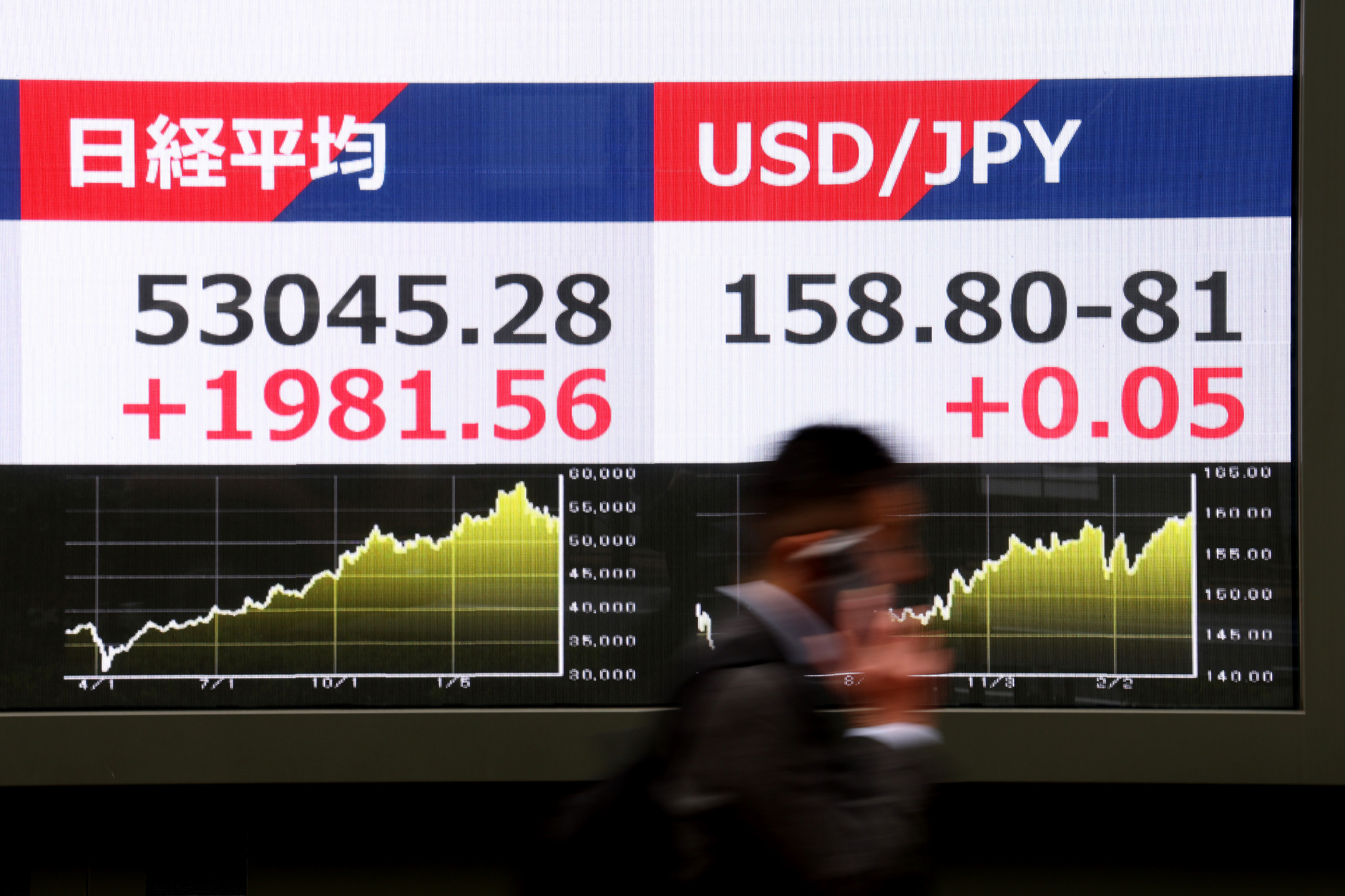 5万3000円を超える日経平均株価とドル円相場を示すモニター=1日午前、東京都中央区