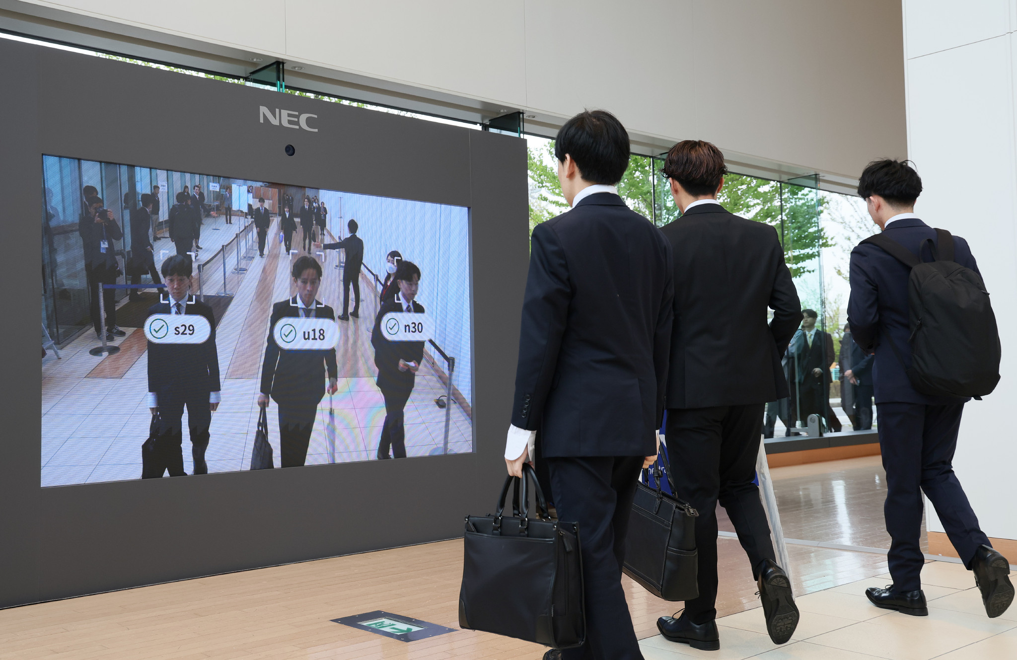 自社の顔認証技術を活用した受付で入社式会場に入るNECの新入社員=1日午前、川崎市