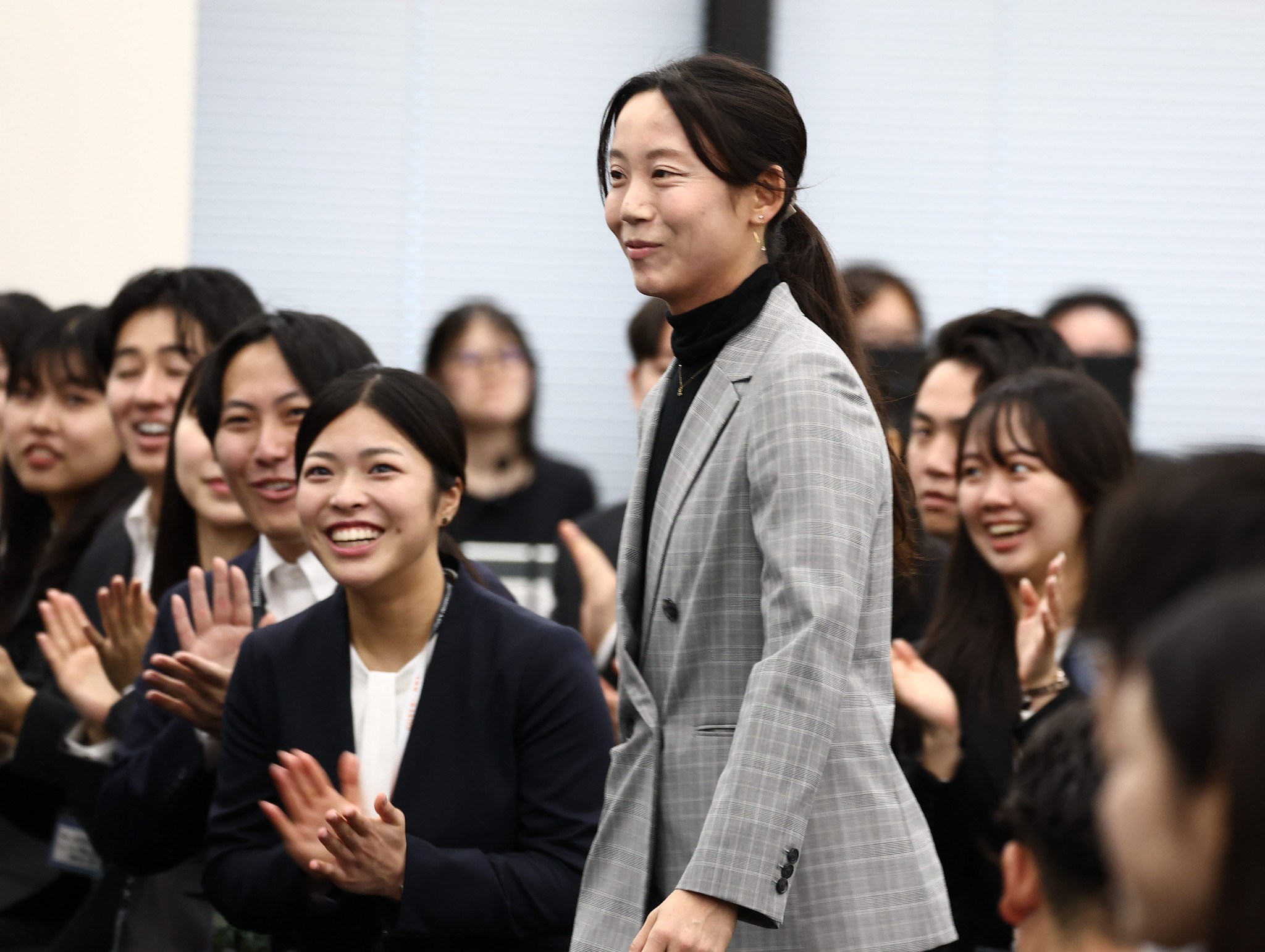 住友商事の入社式に来場したスピードスケート元日本代表の高木美帆さん=1日午前、東京都千代田区