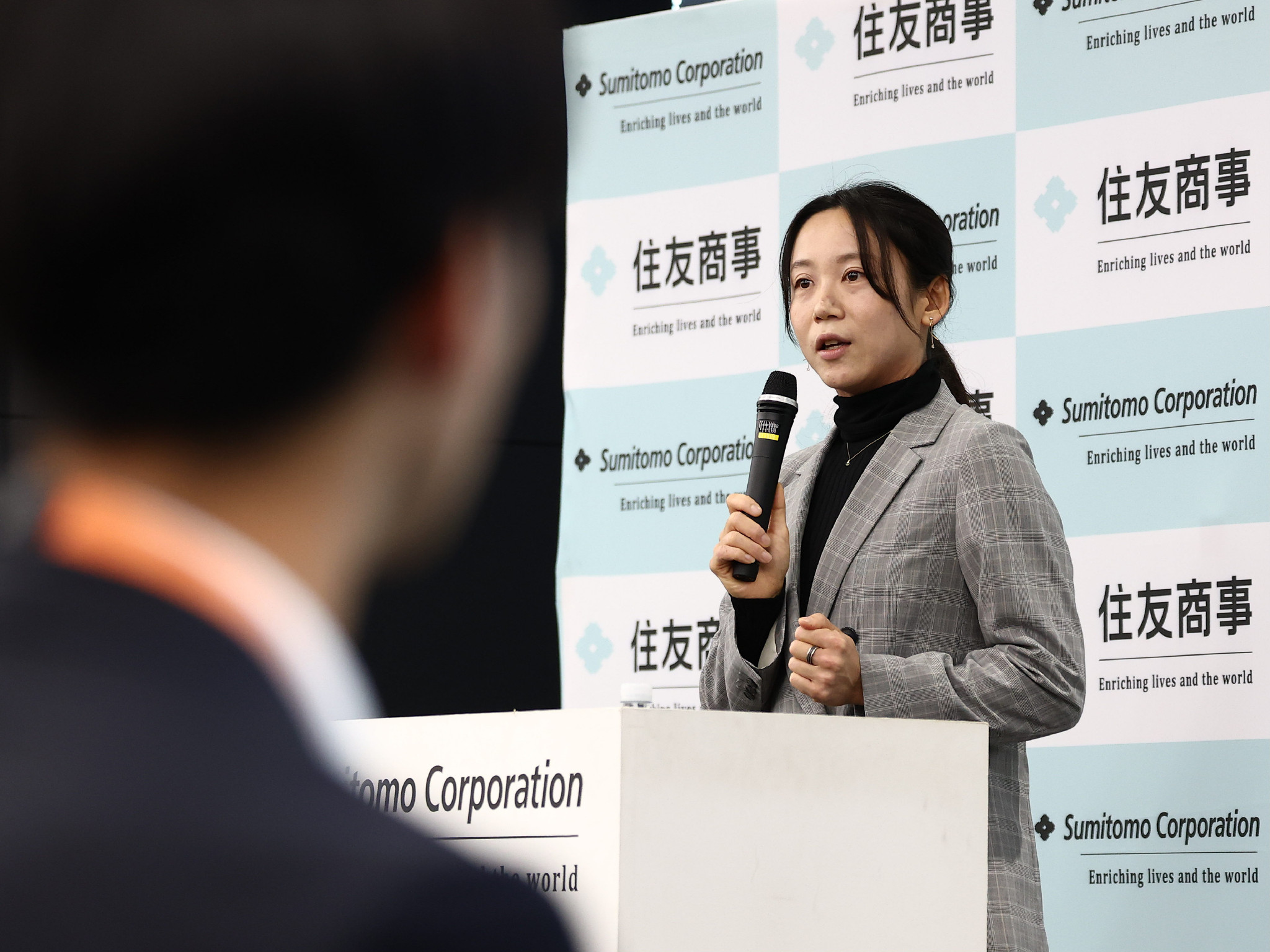住友商事の入社式で新入社員にあいさつするスピードスケート元日本代表の高木美帆さん=1日午前、東京都千代田区