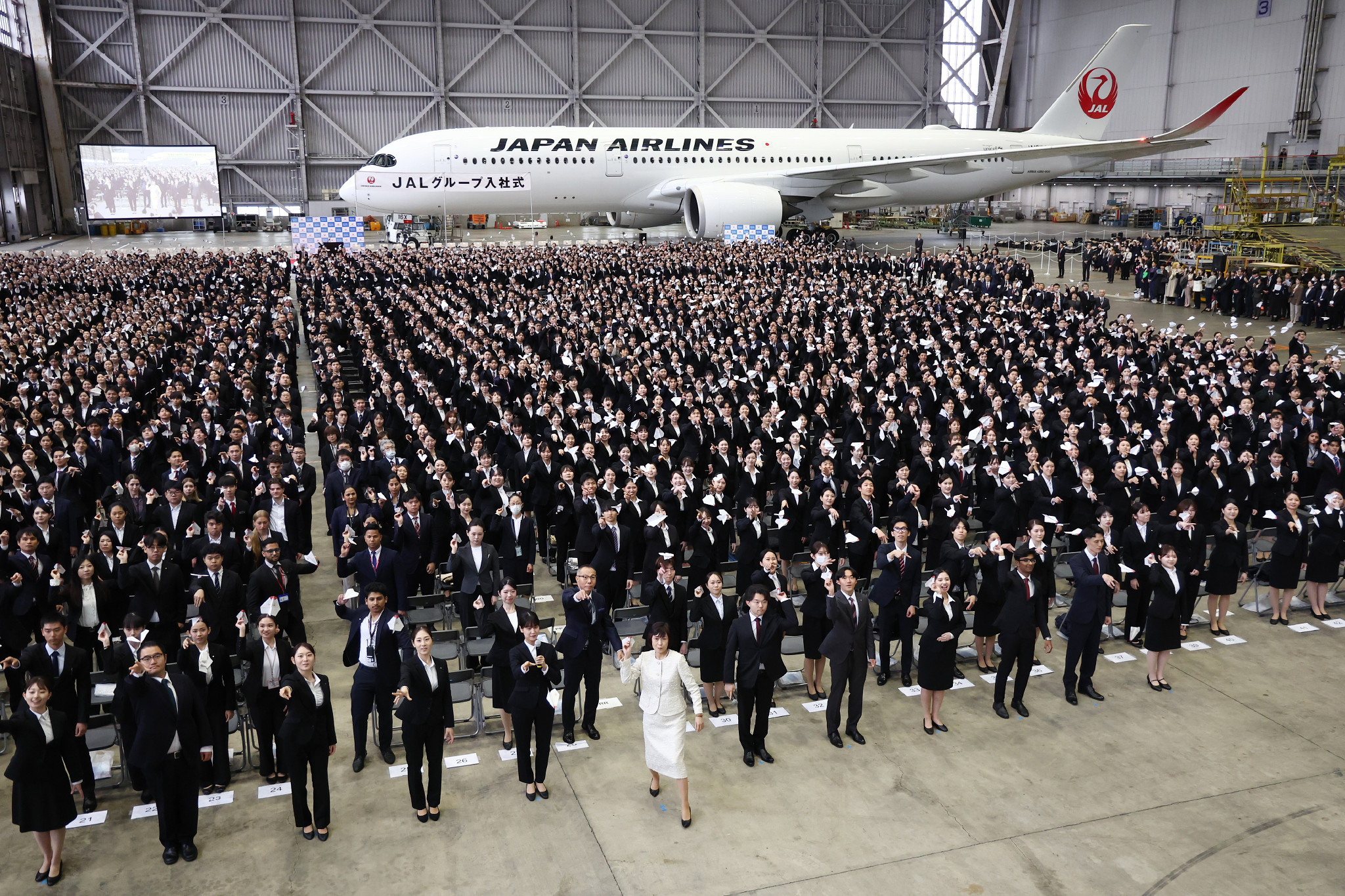 日本航空(JAL)グループの入社式で紙飛行機を飛ばす新入社員。手前中央は日本航空の鳥取三津子社長=1日午後、東京・羽田空港
