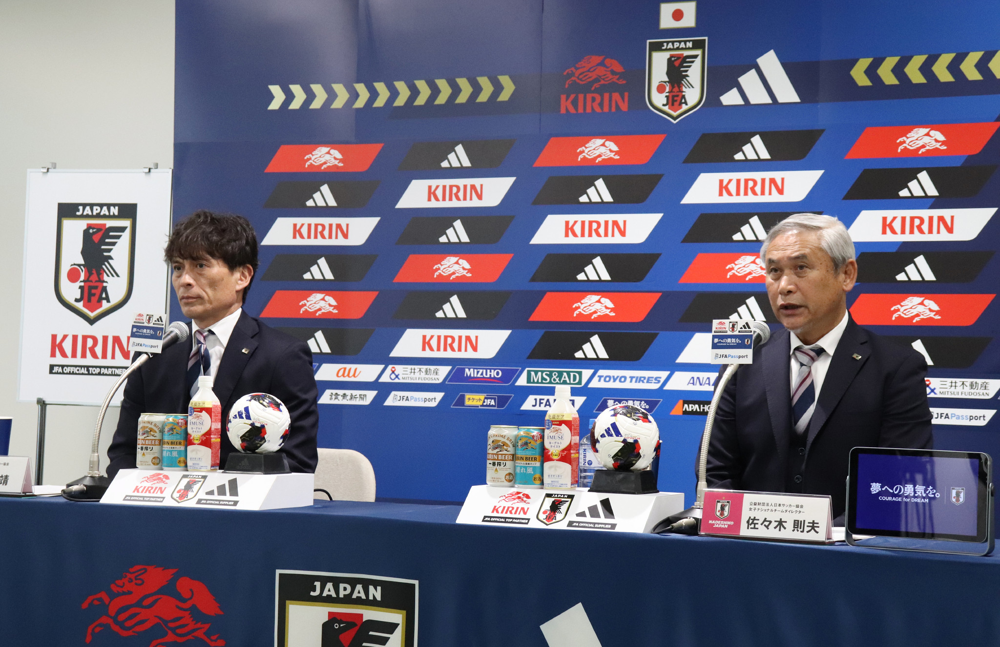 記者会見する日本サッカー協会の佐々木則夫女子ナショナルチームダイレクター(右)。左は宮本恒靖会長=2日、東京都文京区