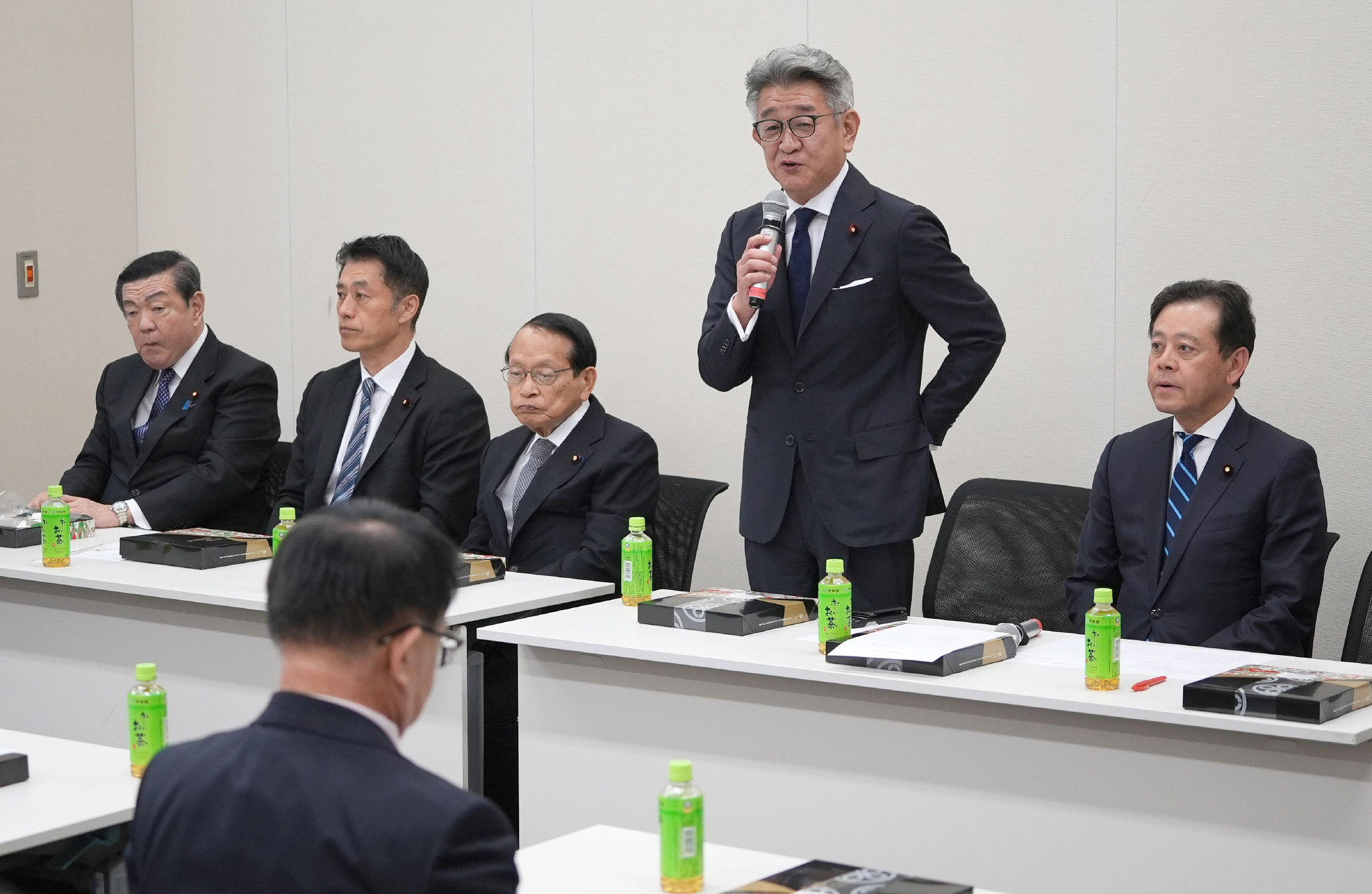 自身がトップの「総合安全保障研究会」の会合であいさつする自民党の武田良太元総務相(右から2人目)=2日午後、国会内