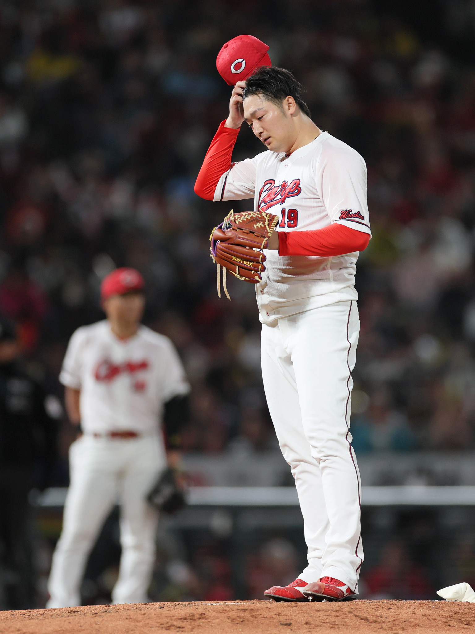 広島―阪神。6回、阪神に追加点を奪われ、さえない表情を見せる広島先発の床田=3日、マツダスタジアム