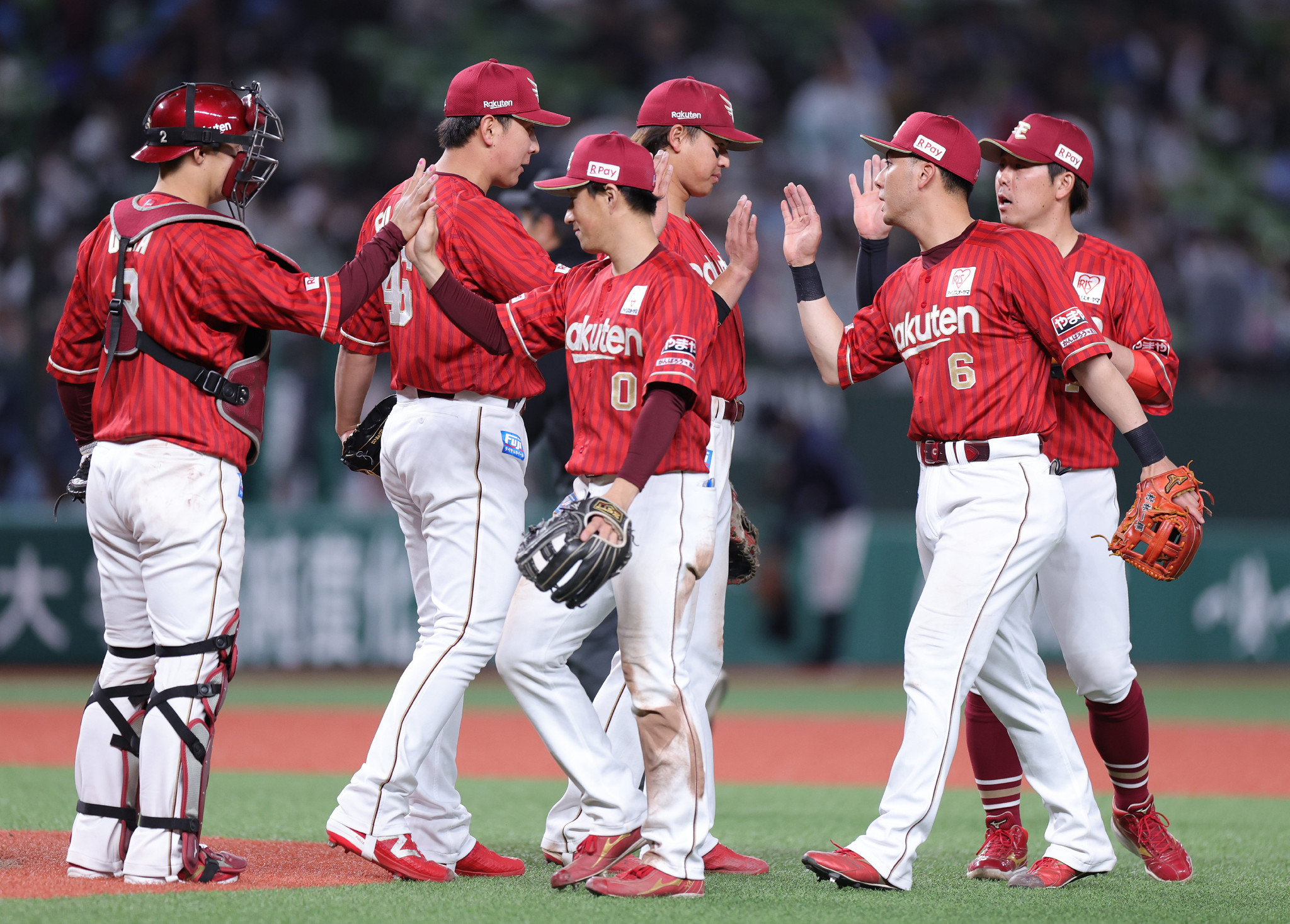 西武に勝利し、喜ぶ楽天ナイン=3日、ベルーナドーム