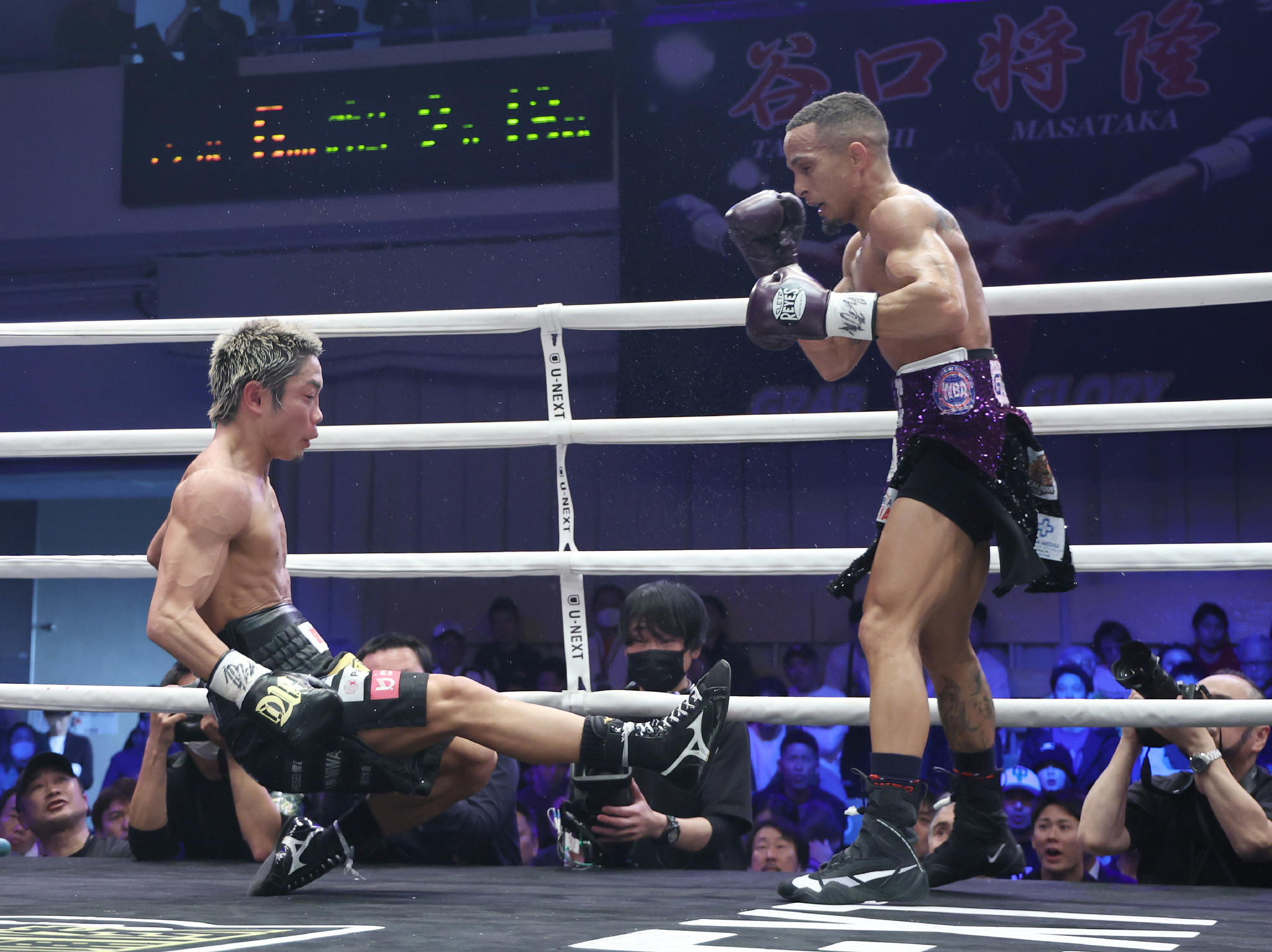 WBA、WBOライトフライ級タイトルマッチの5回、サンティアゴ(右)にダウンを奪われる谷口将隆=3日、東京・後楽園ホール