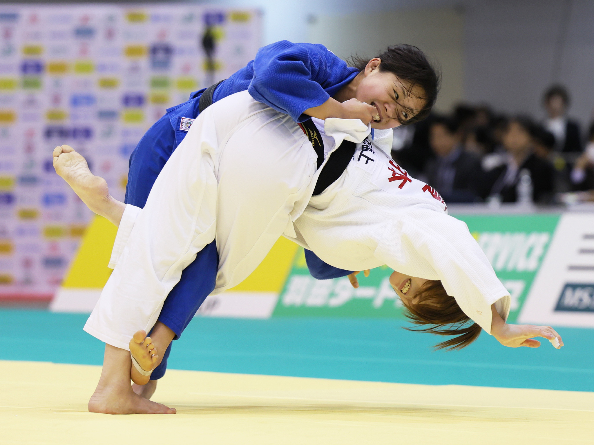 女子48キロ級決勝、古賀若菜(下)から有効を奪う近藤美月=4日、福岡国際センター