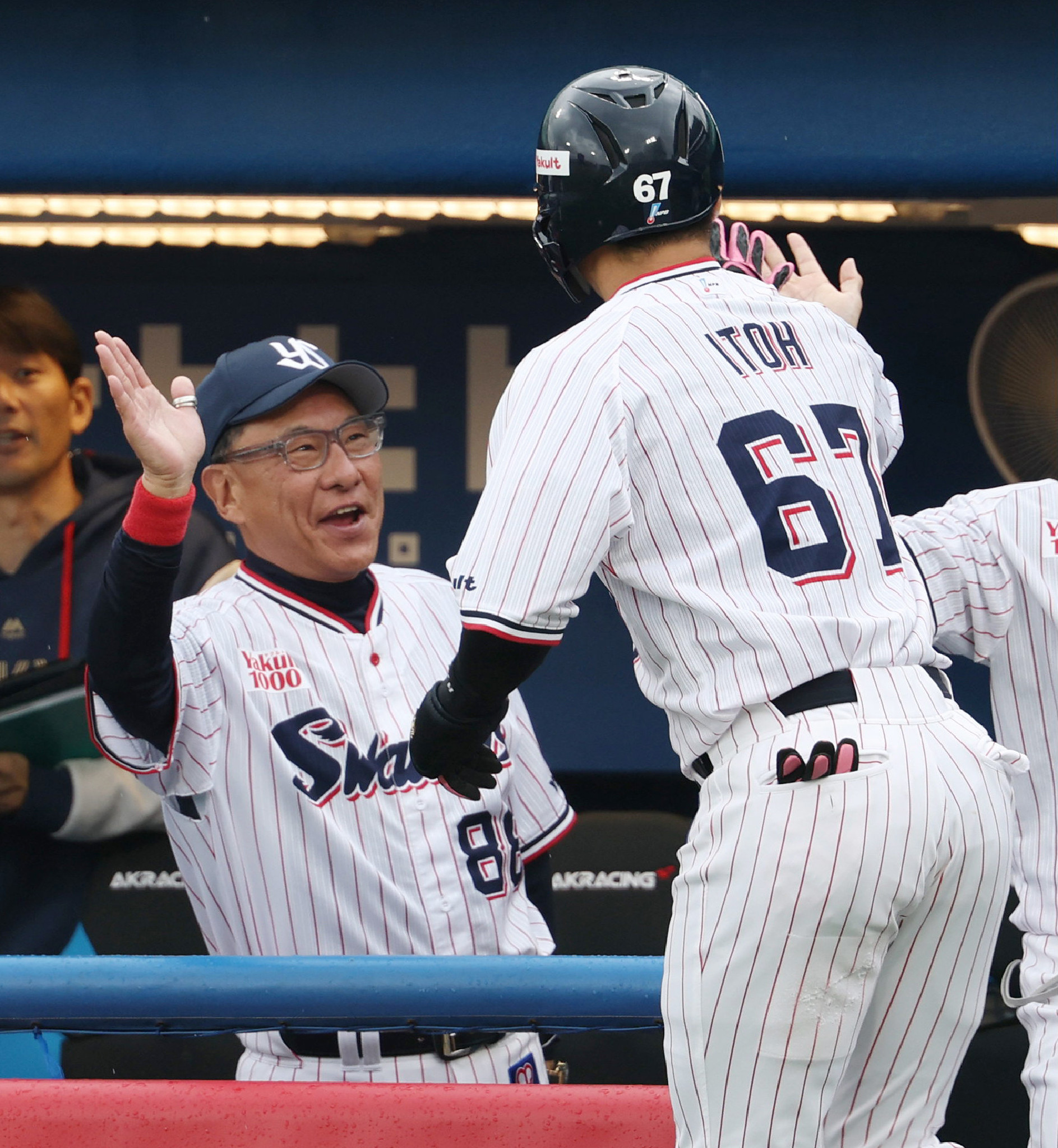 ヤクルト―中日。2回、同点ソロ本塁打を放った伊藤(右)を迎えるヤクルトの池山監督=4日、神宮