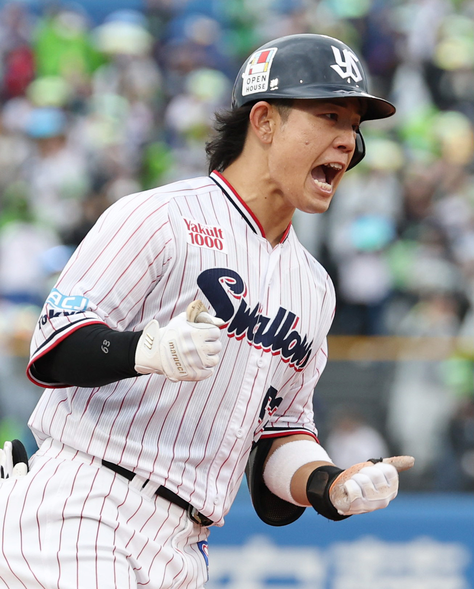 ヤクルト―中日。3回、3ランを放ち、雄たけびを上げるヤクルトの増田=4日、神宮