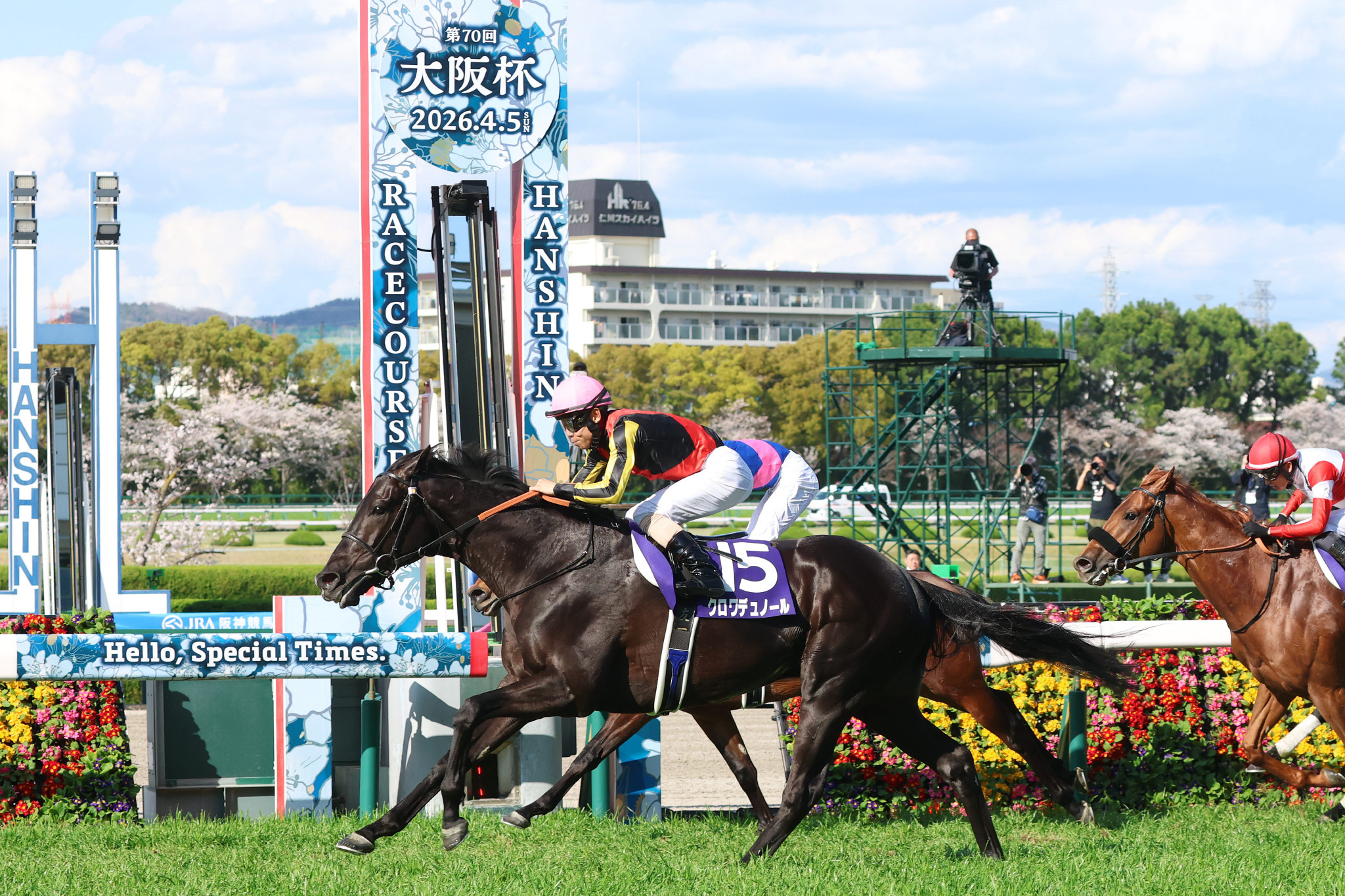 中央競馬の第70回大阪杯(GI、1着賞金3億円)は5日、阪神競馬場の芝2000メートルコースに15頭が出走して行われ、北村友一が騎乗した単勝1番人気のクロワデュノール(左)が1分57秒6で優勝した。