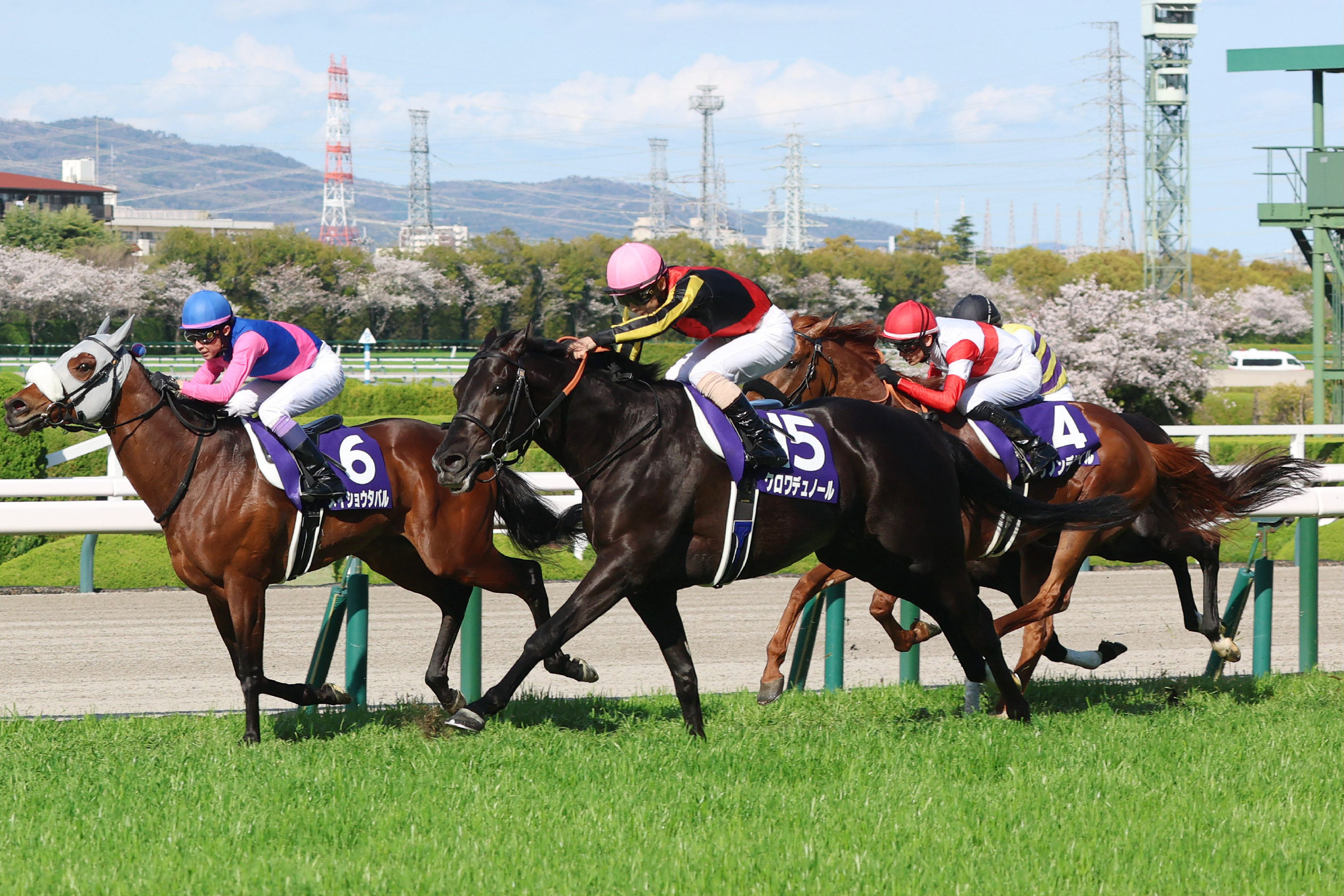 第70回大阪杯を制した北村友一騎乗のクロワデュノール(中央)=5日、阪神競馬場