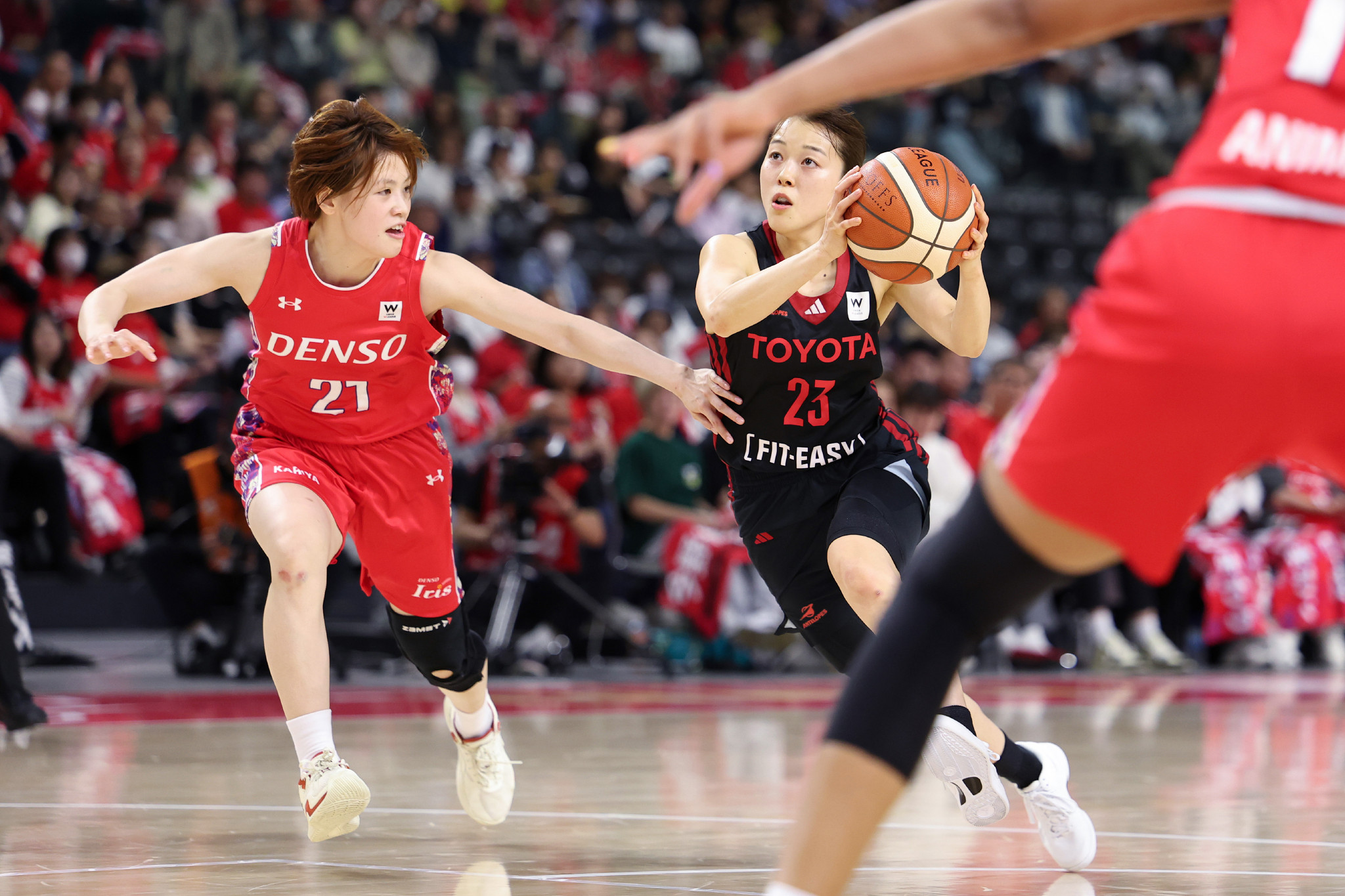 バスケットボール女子Wリーグのプレーオフ。デンソー戦で攻め込むトヨタ自動車の山本(右)=5日、京王アリーナ東京