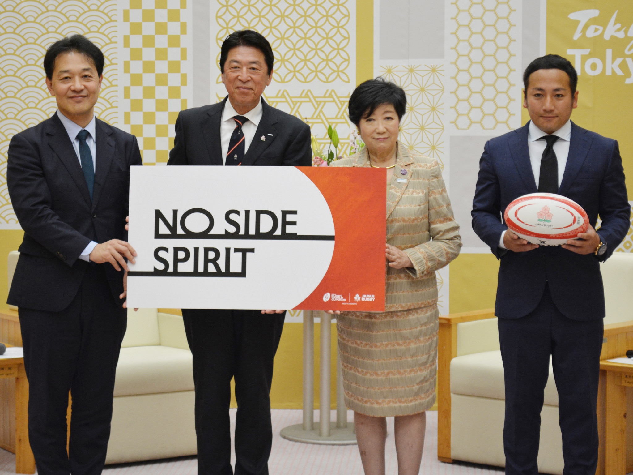 ラグビーの2035年ワールドカップ開催地に立候補した日本協会の土田雅人会長(左から2人目)が6日、東京都庁で小池百合子都知事(右から2人目)を表敬訪問した。元日本代表の流大(右端)も同席。