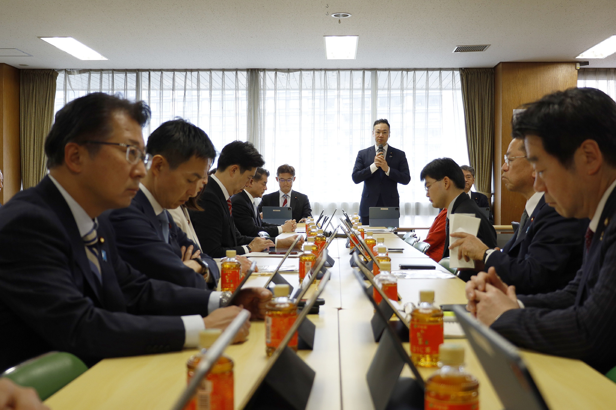 再審制度の見直しを巡り、自民党法務部会・司法制度調査会の合同会議で発言する鈴木馨祐前法相(奥右)=6日午後、東京・永田町の同党本部