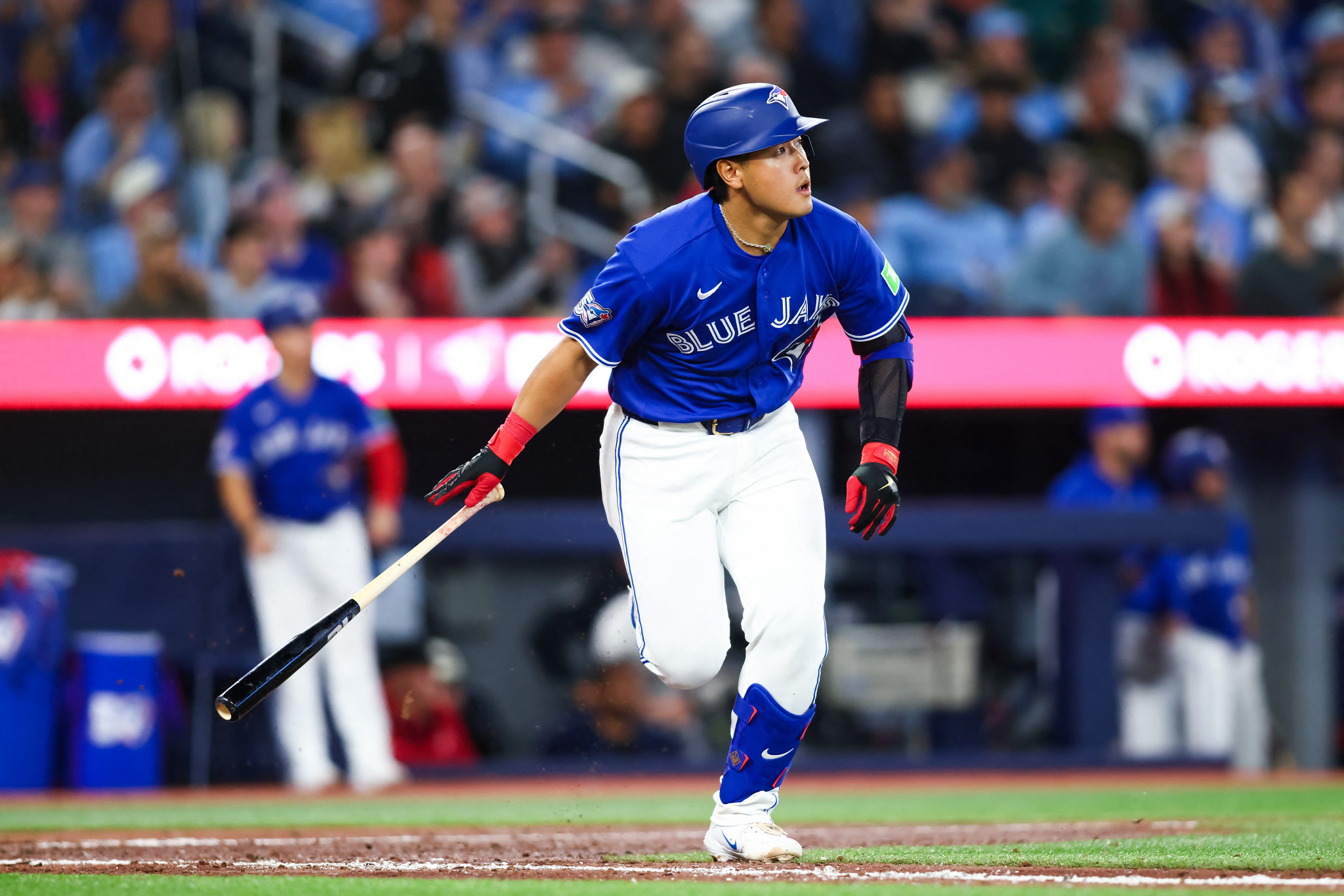 ドジャース戦の7回、二塁打を放つブルージェイズの岡本=7日、トロント