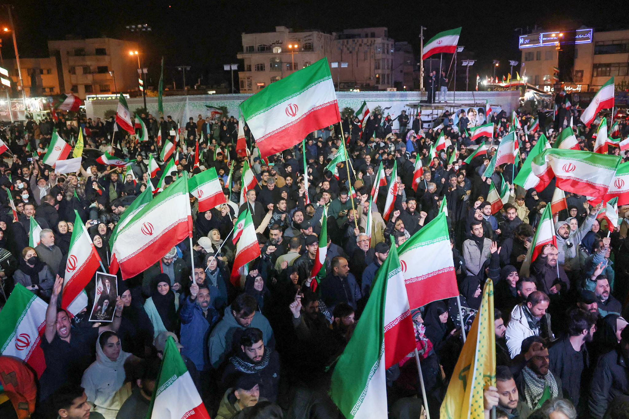 米国と2週間の停戦で合意したイランでは8日、未明にもかかわらず大勢の市民が街頭に繰り出し、歓喜の声を上げた。写真は、首都テヘランの広場に集まった市民ら。【AFP時事】