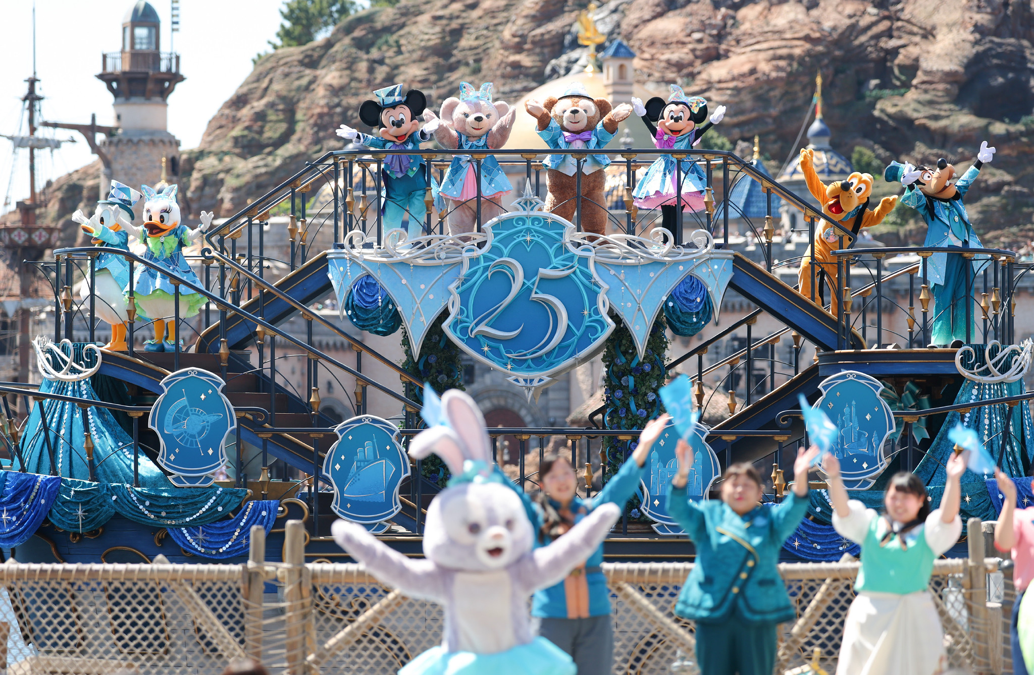 報道陣に公開された東京ディズニーシー25周年イベントの船上ショー=8日、千葉県浦安市