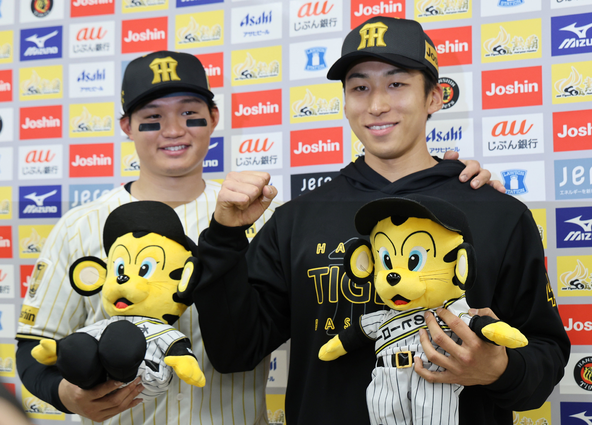 阪神―ヤクルト。ヒーローインタビューの後、ポーズを取る阪神の茨木(右)と森下=9日、甲子園