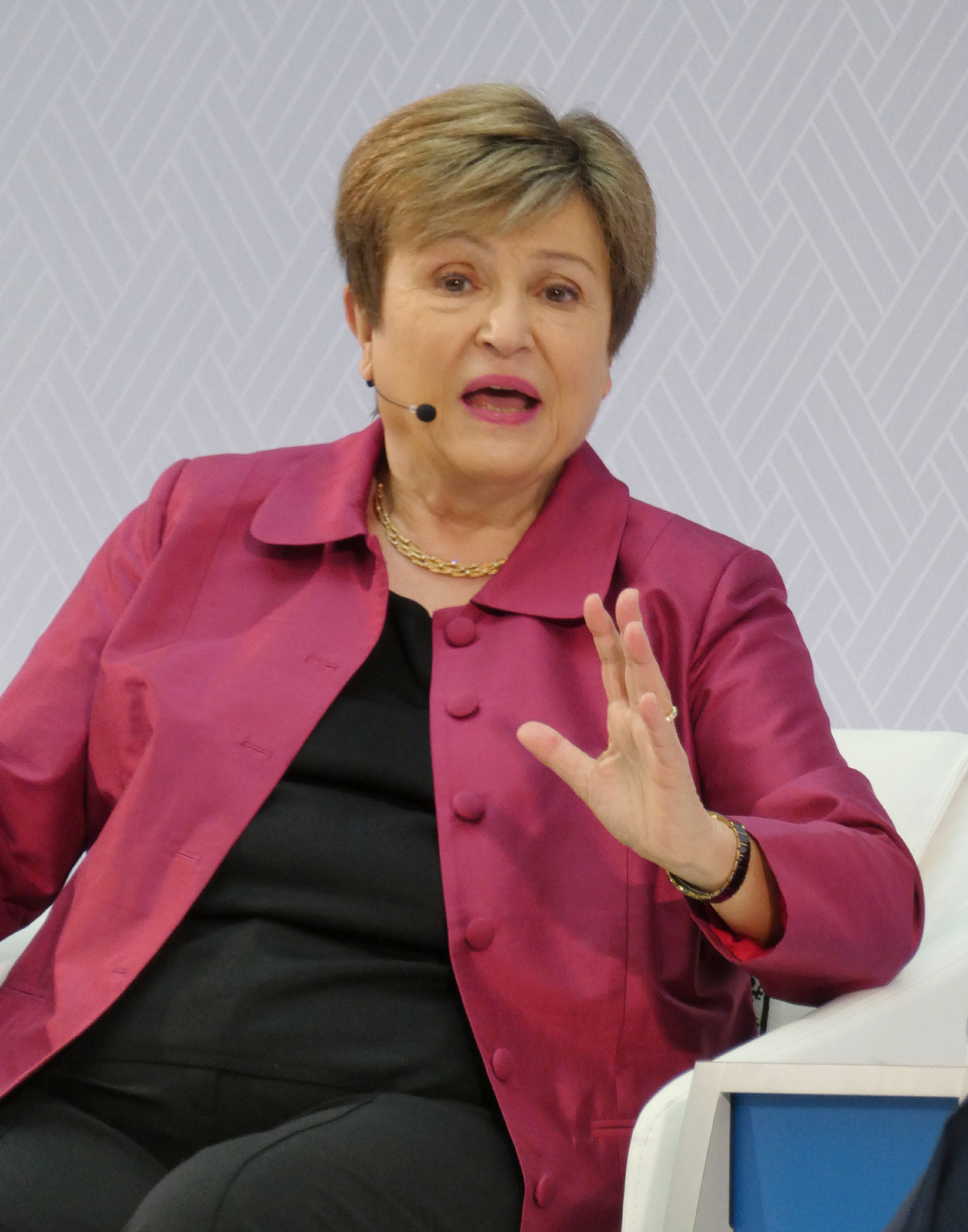 9日、ワシントン市内で講演後、質疑に応じる国際通貨基金(IMF)のゲオルギエワ専務理事。原油価格高騰により、加盟国が経済危機に陥った場合に金融支援を行う「火力(資金力)が必要だ」と述べた。