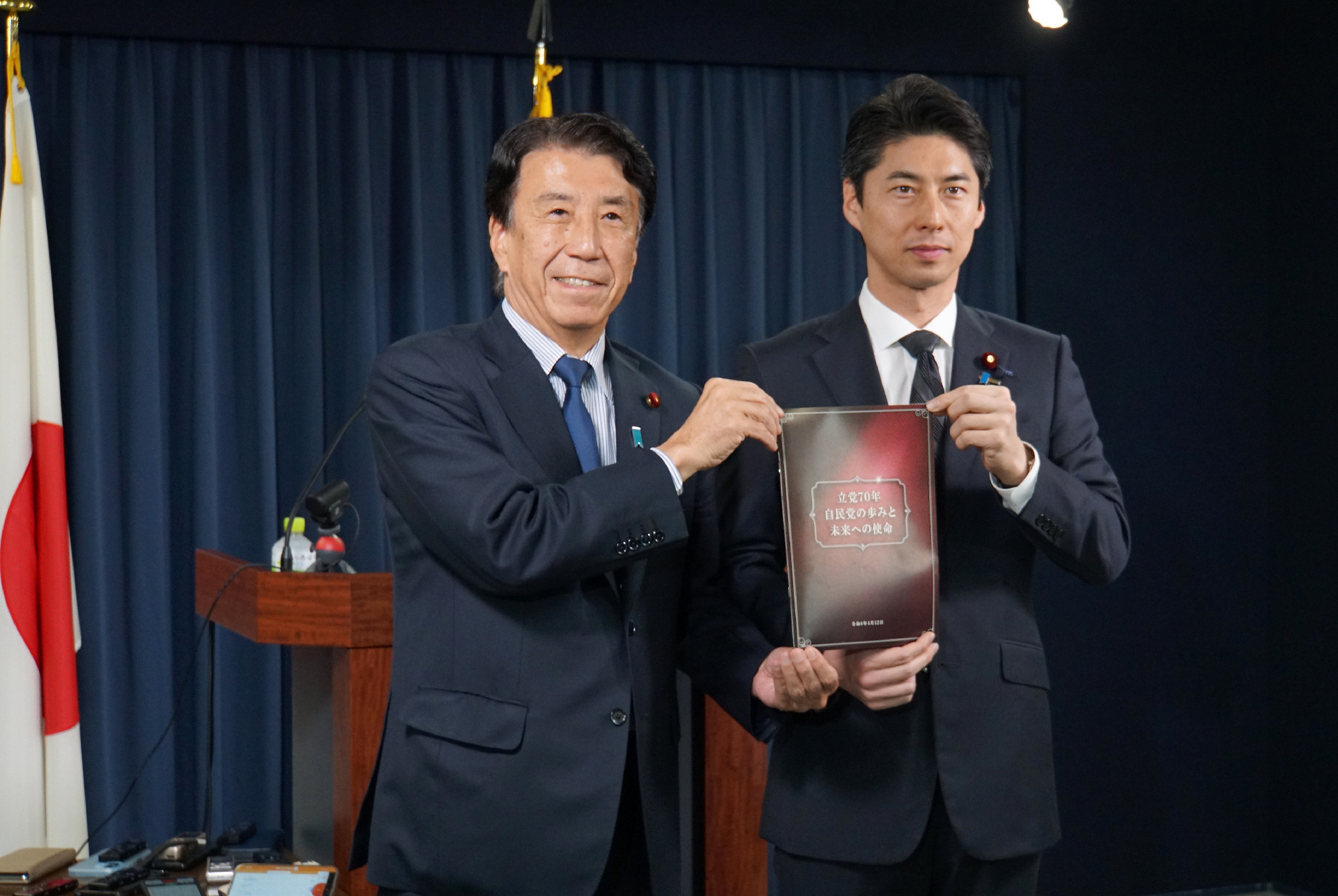 自民党は10日、昨年の結党70年を踏まえた新ビジョン「自民党の歩みと未来への使命」を公表した。写真は新ビジョンを公表する同党の新ビジョン策定本部の斎藤健座長(左)。