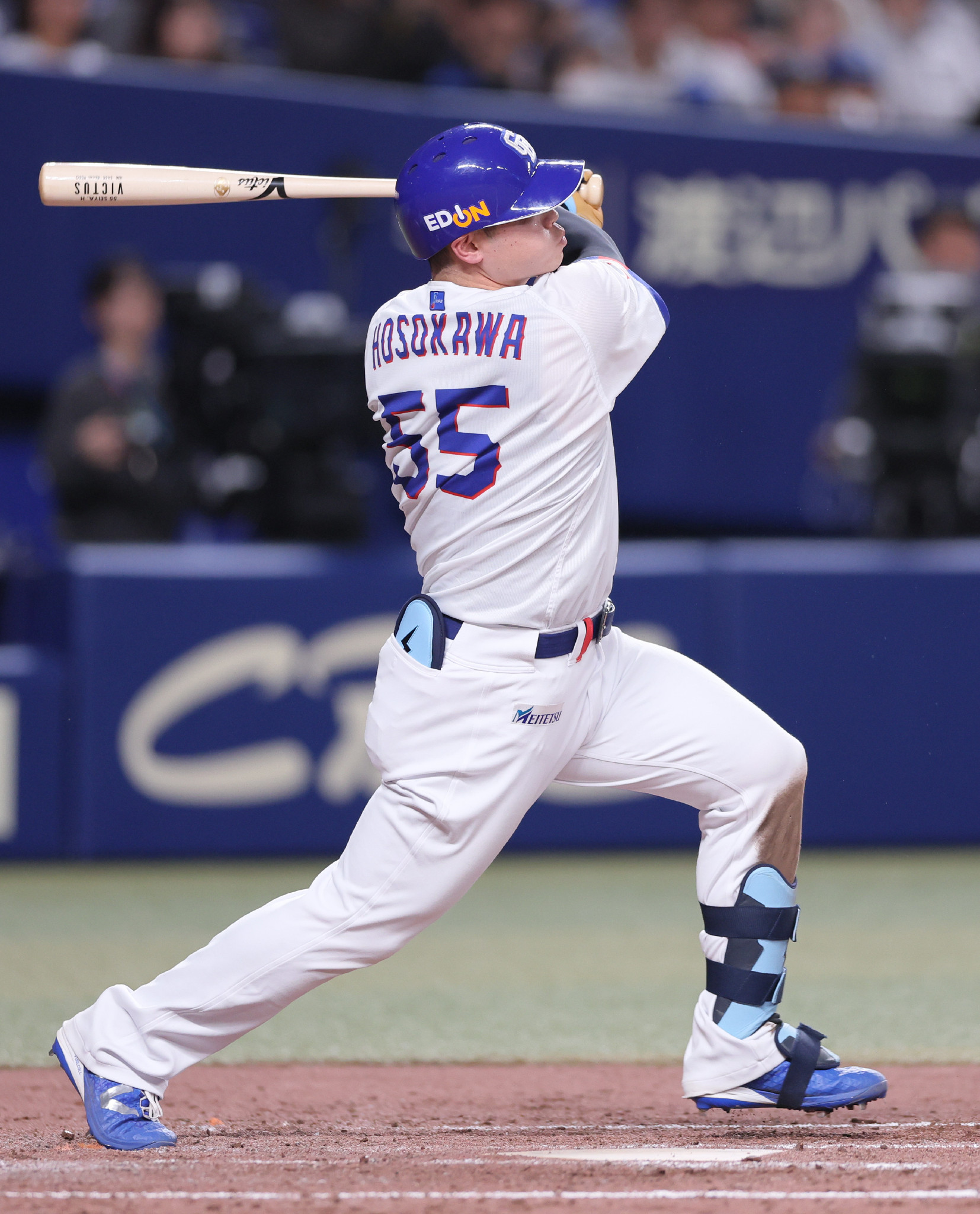 中日―阪神。3回、適時二塁打を放つ中日の細川=10日、バンテリンドーム