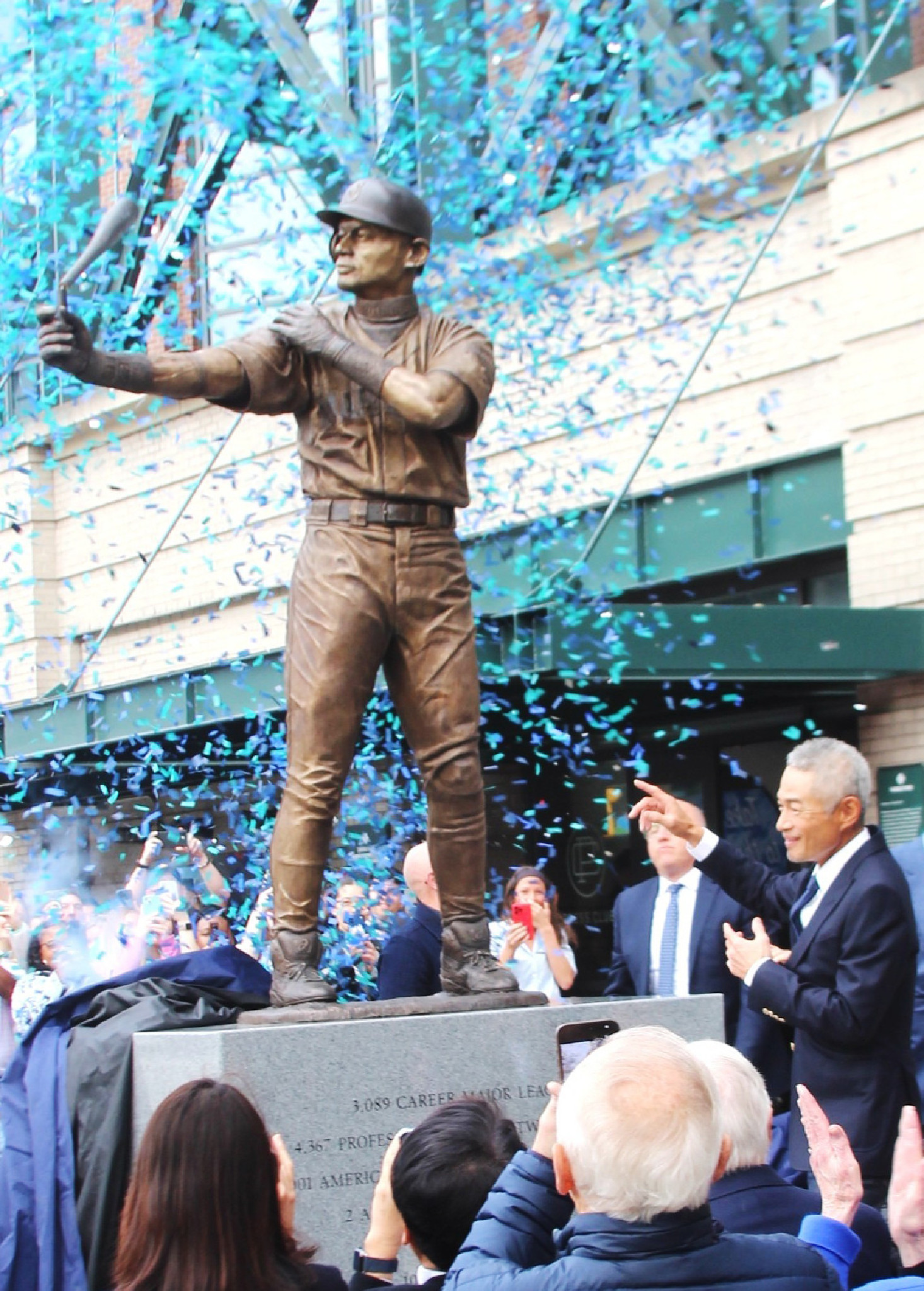 米大リーグ、マリナーズの本拠地球場で10日、アジア人として初めて2025年に米野球殿堂入りしたイチローさんの銅像がお披露目された。写真は除幕式で、折れたバット部分を指さすイチローさん(右)=シアトル