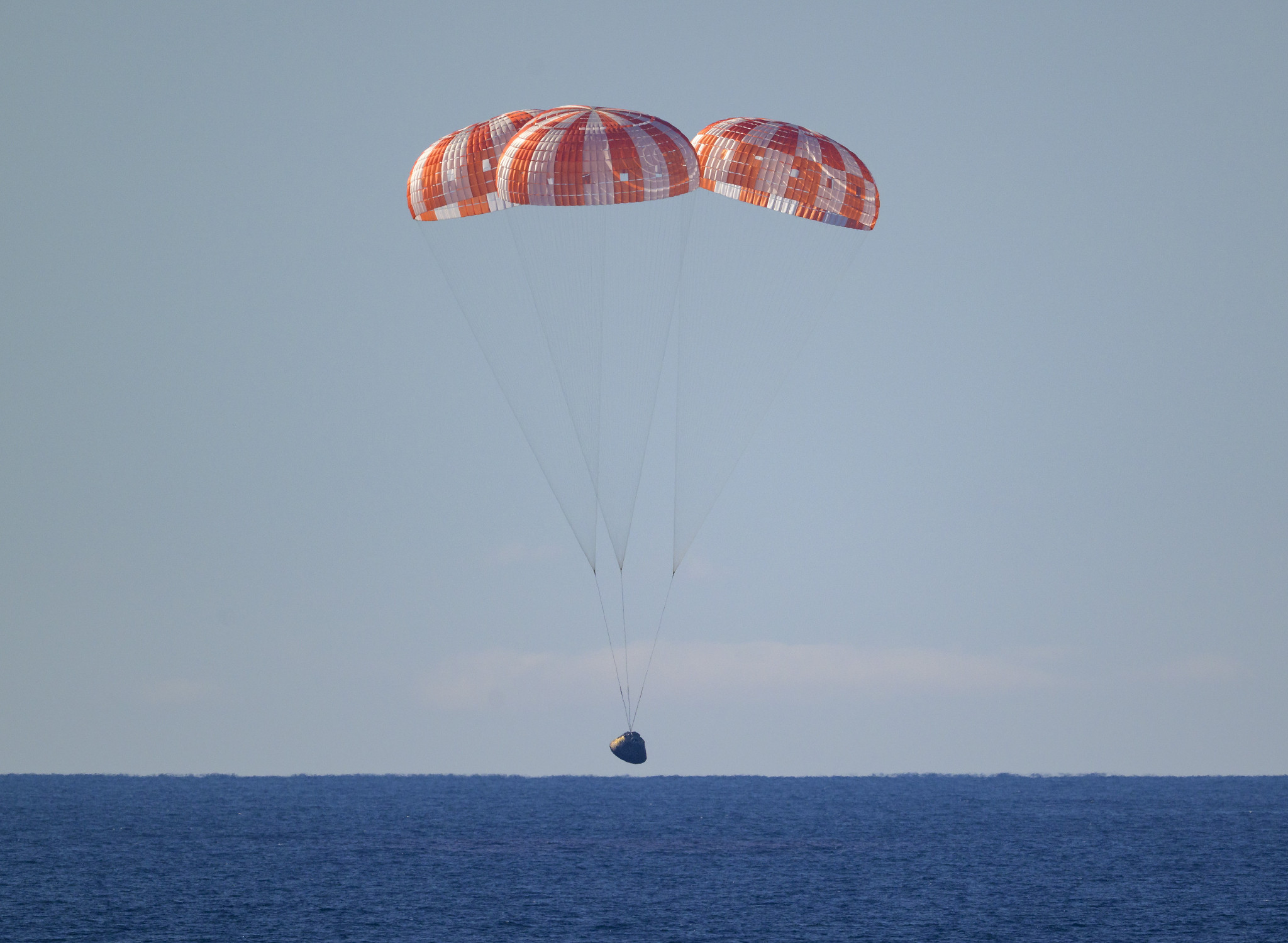 米航空宇宙局(NASA)の有人宇宙船「オリオン」は米東部時間10日午後8時(日本時間11日午前9時)ごろ、地球に帰還した。写真は太平洋に降下する「オリオン」=NASA提供【EPA時事】