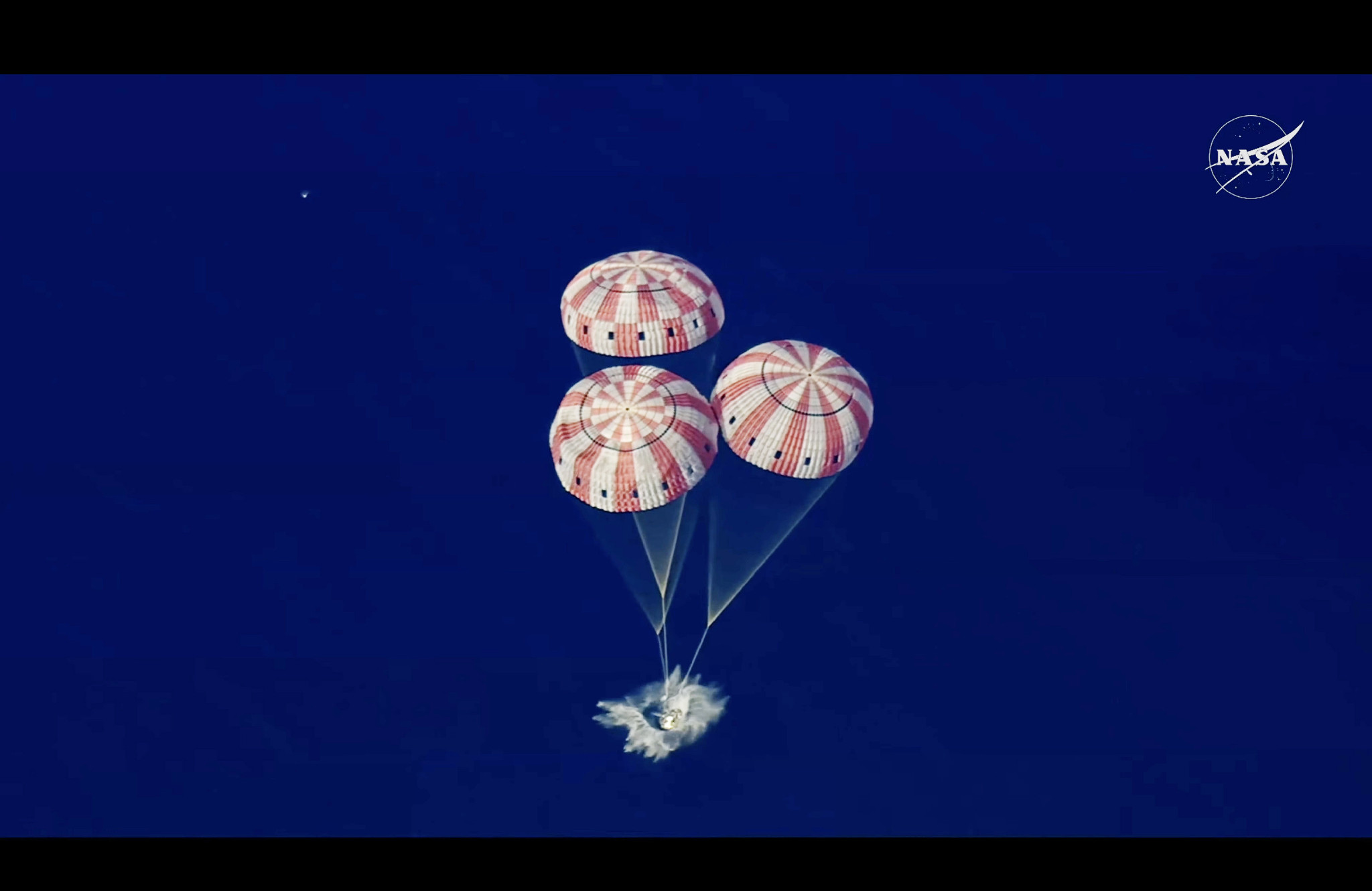 10日、太平洋に着水した宇宙船「オリオン」=NASA提供の動画より