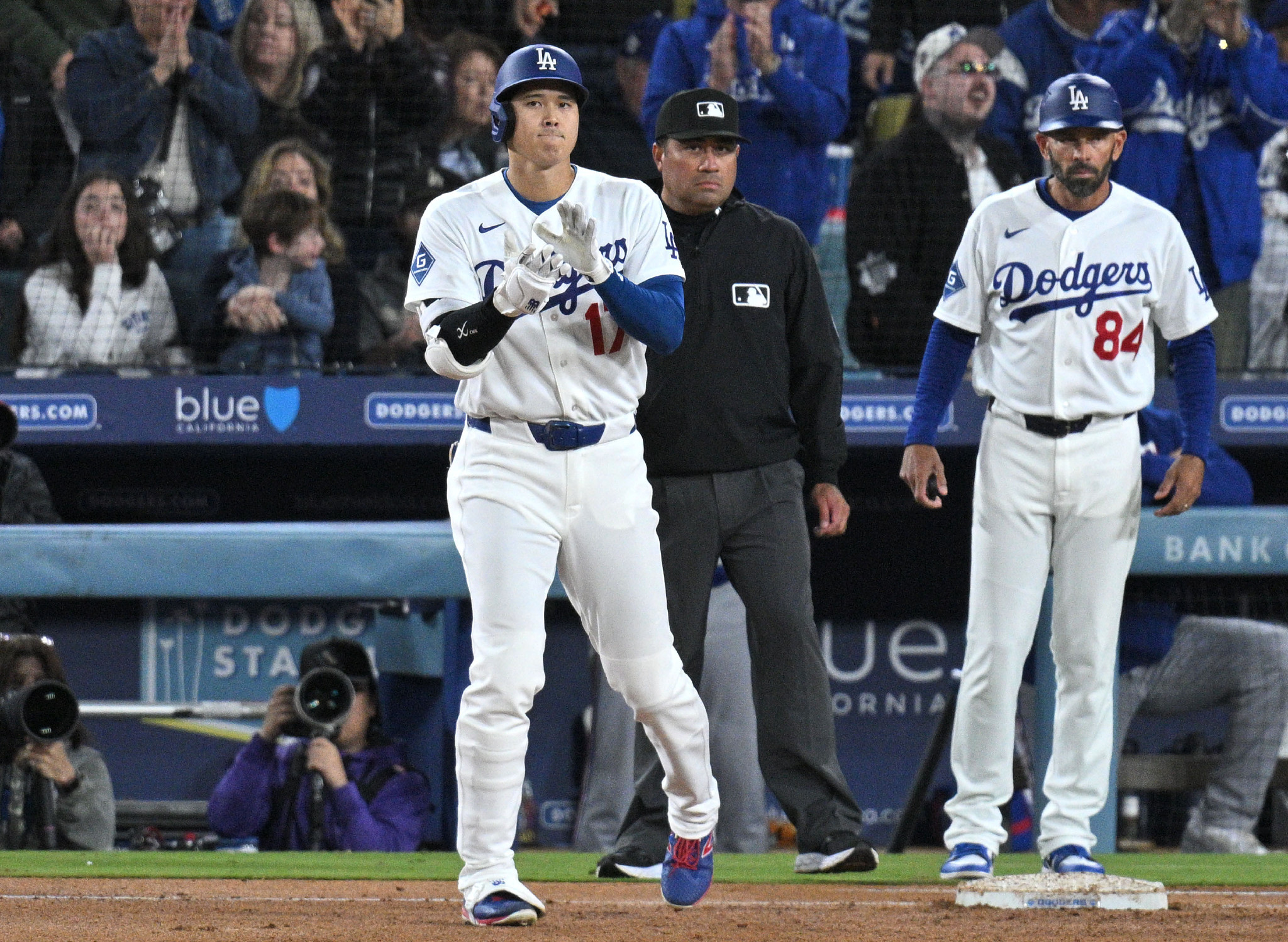大リーグ。レンジャーズ戦の5回、右前打を放ち、昨季から続く連続出塁を44試合に伸ばしたドジャースの大谷(左)=10日、ロサンゼルス