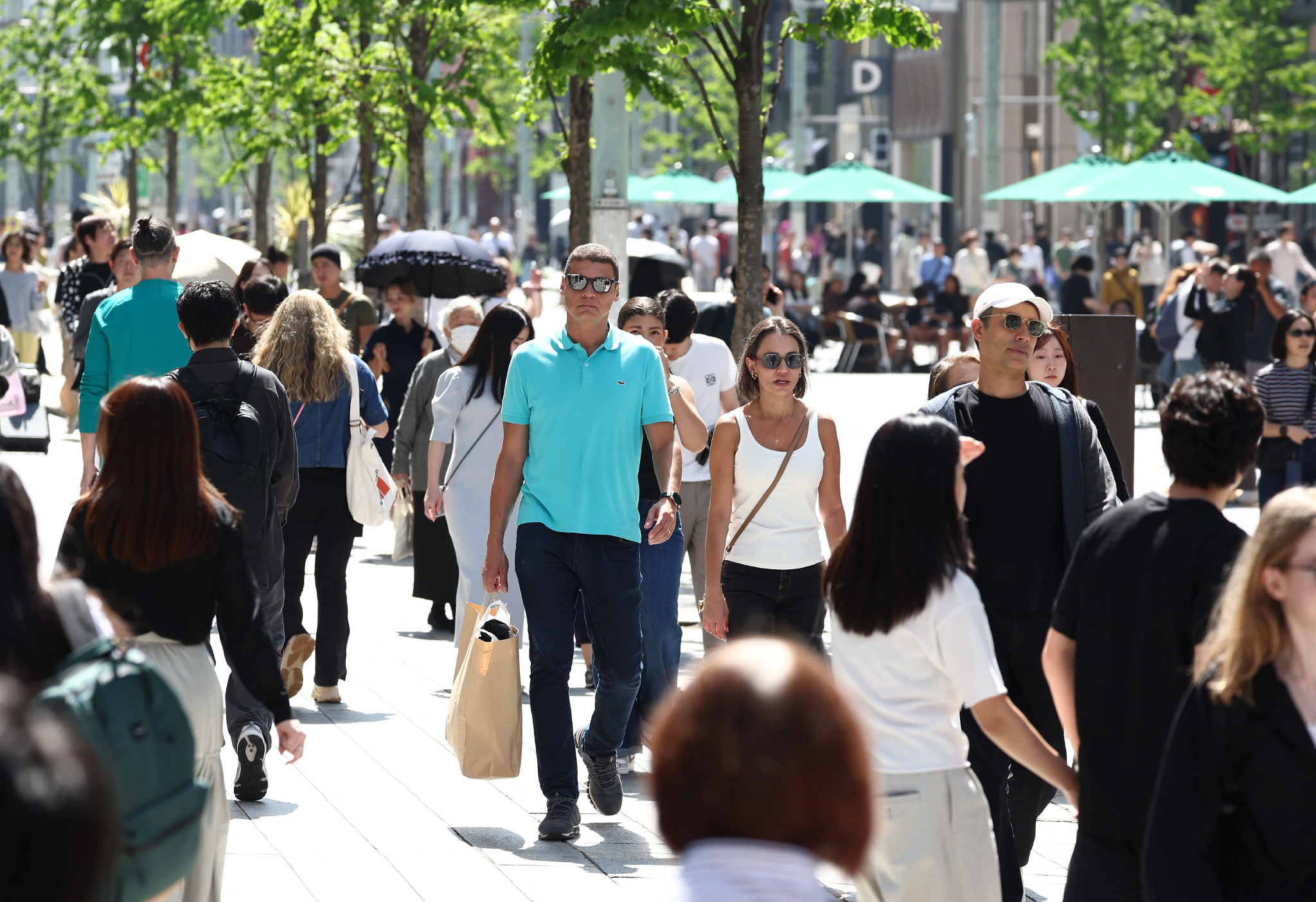 11日、気象庁によると東京都心では午後1時に26.7度を記録し今年初めての夏日になった。銀座周辺では半袖姿で歩く人の姿も見られた。