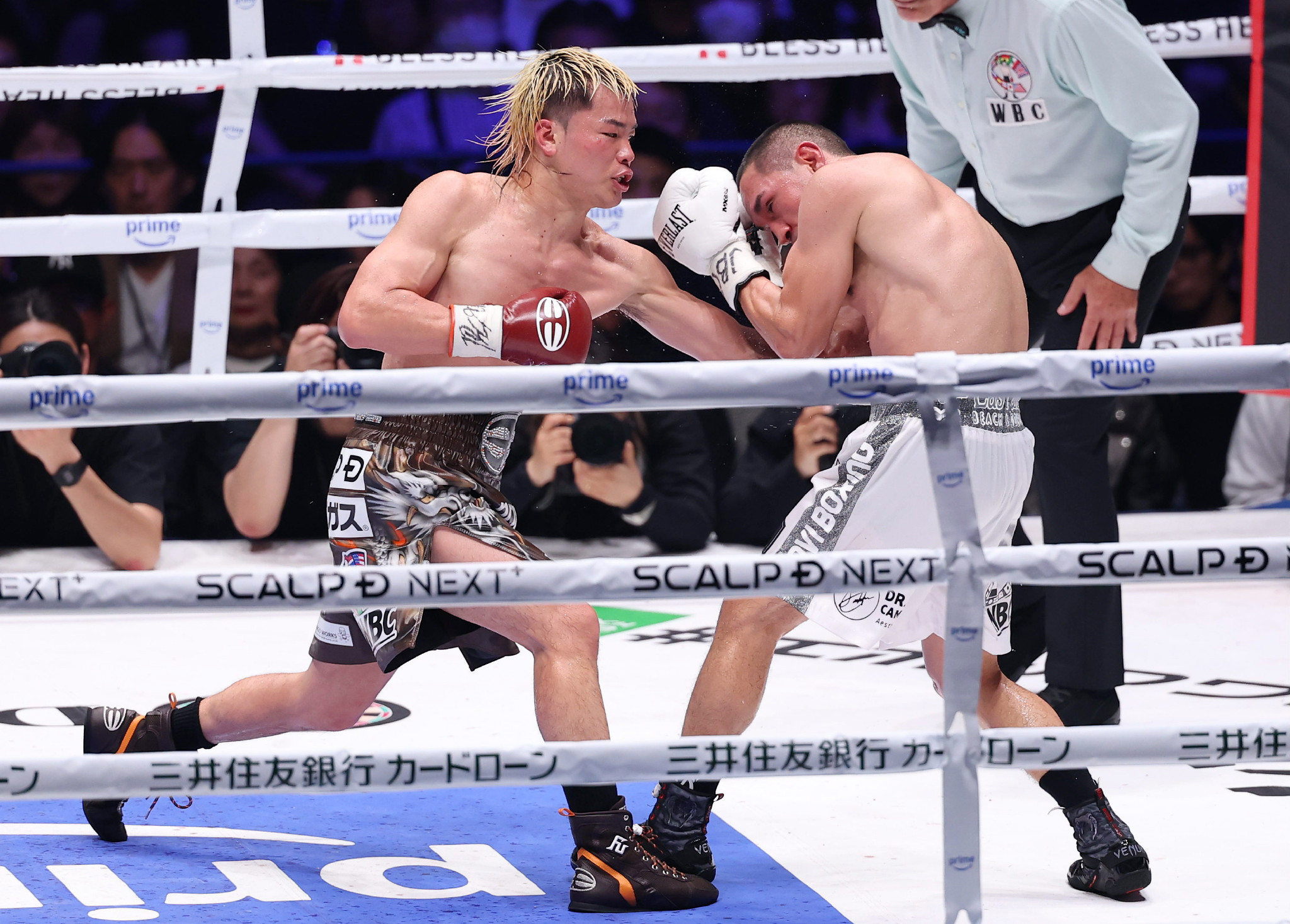 WBCバンタム級挑戦者決定戦の9回、エストラーダ(右)を攻める那須川天心=11日、東京・両国国技館